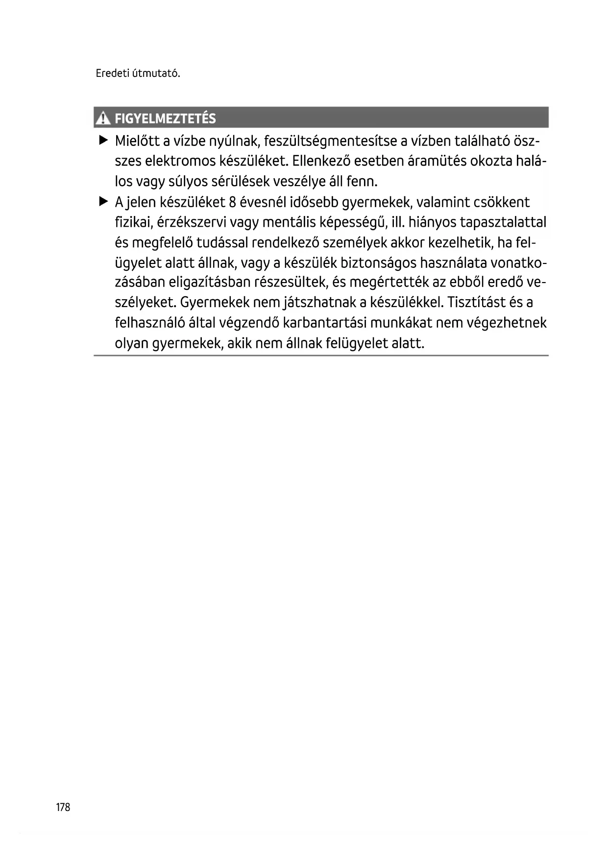 FIGYELMEZTETÉS Mielőtt a vízbe nyúlnak, feszültségmentesítse a vízben található ösz- szes elektromos készüléket. Ellenkező esetben áramütés okozta halá- los vagy súlyos sérülések veszélye áll fenn. A jelen készüléket 8 évesnél idősebb gyermekek, valamint csökkent fizikai, érzékszervi vagy mentális képességű, ill. hiányos tapasztalattal és megfelelő tudással rendelkező személyek akkor kezelhetik, ha fel- ügyelet alatt állnak, vagy a készülék biztonságos használata vonatko- zásában eligazításban részesültek, és megértették az ebből eredő ve- szélyeket. Gyermekek nem játszhatnak a készülékkel. Tisztítást és a felhasználó által végzendő karbantartási munkákat nem végezhetnek olyan gyermekek, akik nem állnak felügyelet alatt.HU