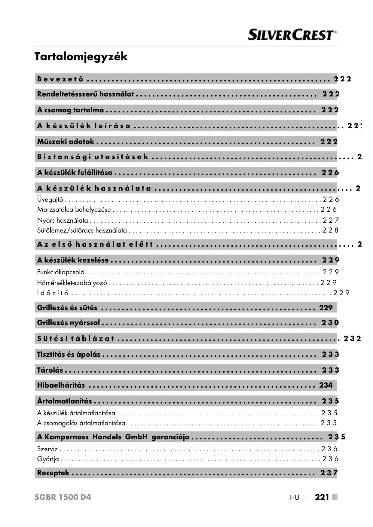 HASZNÁLATI ÚTMUTATÓ SGBR 1500 D4 SILVERCREST