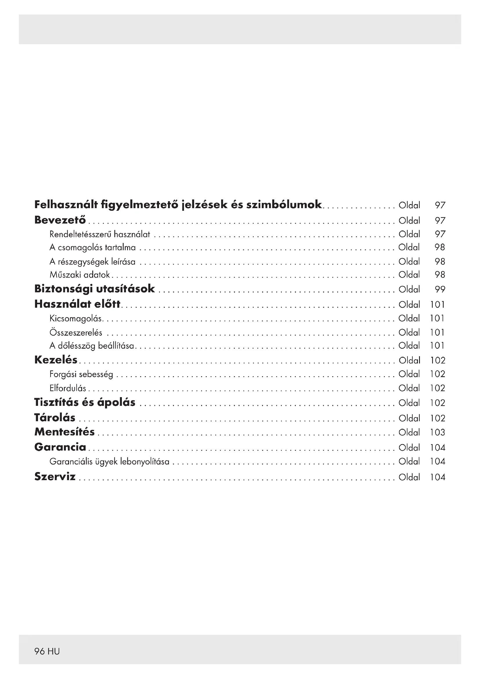 Elektromos biztonság mFIGYELMEZTETÉS! Sérülésveszély! Tisztítás előtt, vagy ha a terméket nem használja, kapcsolja ki a terméket és szüntesse meg az áramellátását. mFIGYELMEZTETÉS! Áramütésveszély! Ügyeljen arra, hogy a hálózati feszültség adatai megfeleljenek az adattáblán feltüntetett névleges feszültség adatainak. mFIGYELMEZTETÉS! Áramütésveszély! Ha a termék elektromos vezetéke megsérül, a kockázatok elkerülése érdekében azt a gyártónak, az ügyfélszolgálatának, vagy egy annak megfelelő képzettségű szakembernek kell kicserélnie. Kezelés A terméket csak száraz helyiségekben, beltéren használja. A terméket, az elektromos vezetéket és a csatlakozót óvja a portól, a közvetlen napfénytől, a rácseppenő vagy ráfröccsenő víztől. mVIGYÁZAT! Sérülésveszély! A védőrács levétele előtt szüntesse meg a termék áramellátását. mVIGYÁZAT! Sérülésveszély! Soha ne használja a terméket védőrács nélkül, vagy ha a védőrács sérült. mVIGYÁZAT! Sérülésveszély! A sérülések és a termék károsodásának megelőzése érdekében a használat során tartsa a kezeit, a haját, a ruházatát és egyéb tárgyakat a biztonsági védőrácstól távol.101