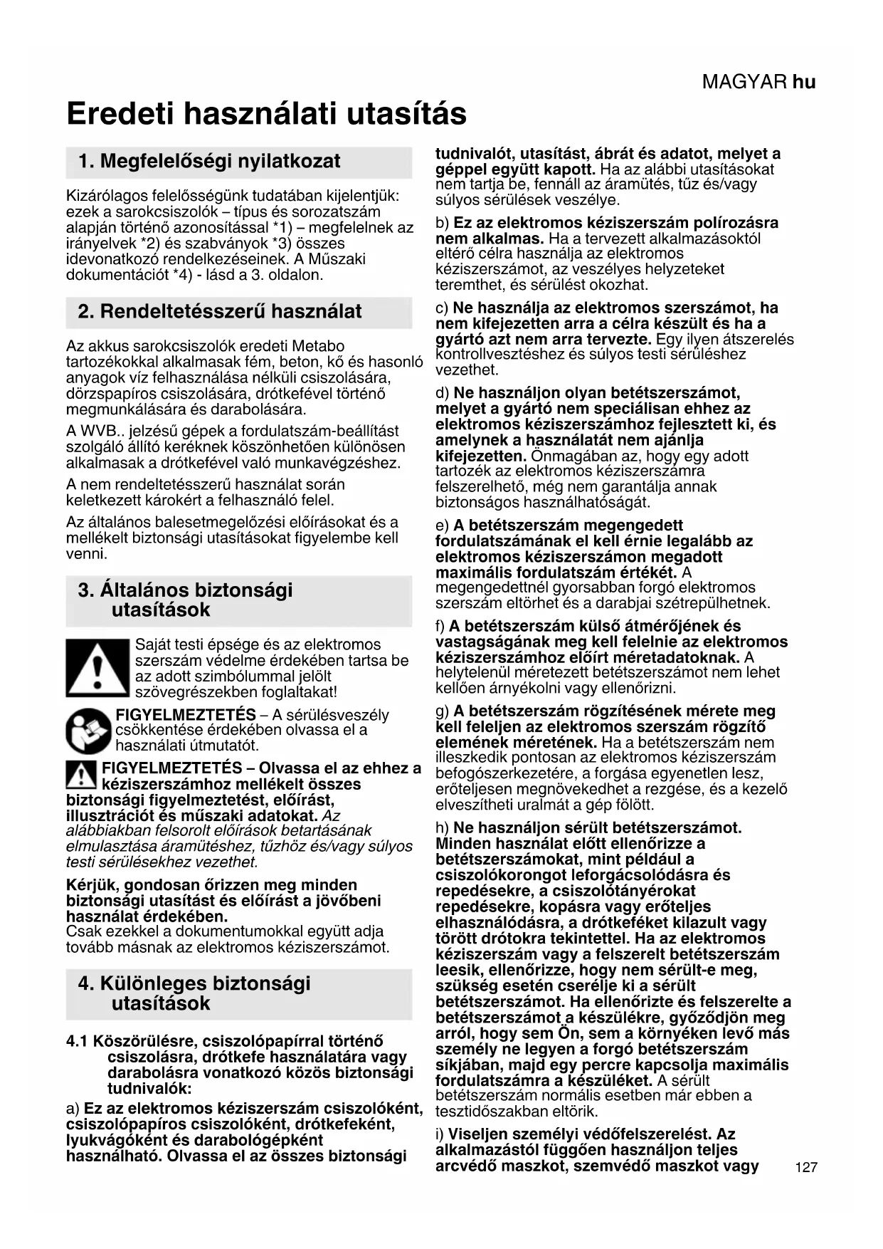Eredeti használati utasítás Kizárólagos felelősségünk tudatában kijelentjük: ezek a sarokcsiszolók – típus és sorozatszám alapján történő azonosítással *1) – megfelelnek az irányelvek *2) és szabványok *3) összes idevonatkozó rendelkezéseinek. A Műszaki dokumentációt *4) - lásd a 3. oldalon. Az akkus sarokcsiszolók eredeti Metabo tartozékokkal alkalmasak fém, beton, kő és hasonló anyagok víz felhasználása nélküli csiszolására, dörzspapíros csiszolására, drótkefével történő megmunkálására és darabolására. A WVB.. jelzésű gépek a fordulatszám-beállítást szolgáló állító keréknek köszönhetően különösen alkalmasak a drótkefével való munkavégzéshez. A nem rendeltetésszerű használat során keletkezett károkért a felhasználó felel. Az általános balesetmegelőzési előírásokat és a mellékelt biztonsági utasításokat figyelembe kell venni. Saját testi épsége és az elektromos szerszám védelme érdekében tartsa be az adott szimbólummal jelölt szövegrészekben foglaltakat! FIGYELMEZTETÉS – A sérülésveszély csökkentése érdekében olvassa el a használati útmutatót. FIGYELMEZTETÉS – Olvassa el az ehhez a kéziszerszámhoz mellékelt összes biztonsági figyelmeztetést, előírást, illusztrációt és műszaki adatokat. Az alábbiakban felsorolt előírások betartásának elmulasztása áramütéshez, tűzhöz és/vagy súlyos testi sérülésekhez vezethet. Kérjük, gondosan őrizzen meg minden biztonsági utasítást és előírást a jövőbeni használat érdekében. Csak ezekkel a dokumentumokkal együtt adja tovább másnak az elektromos kéziszerszámot.