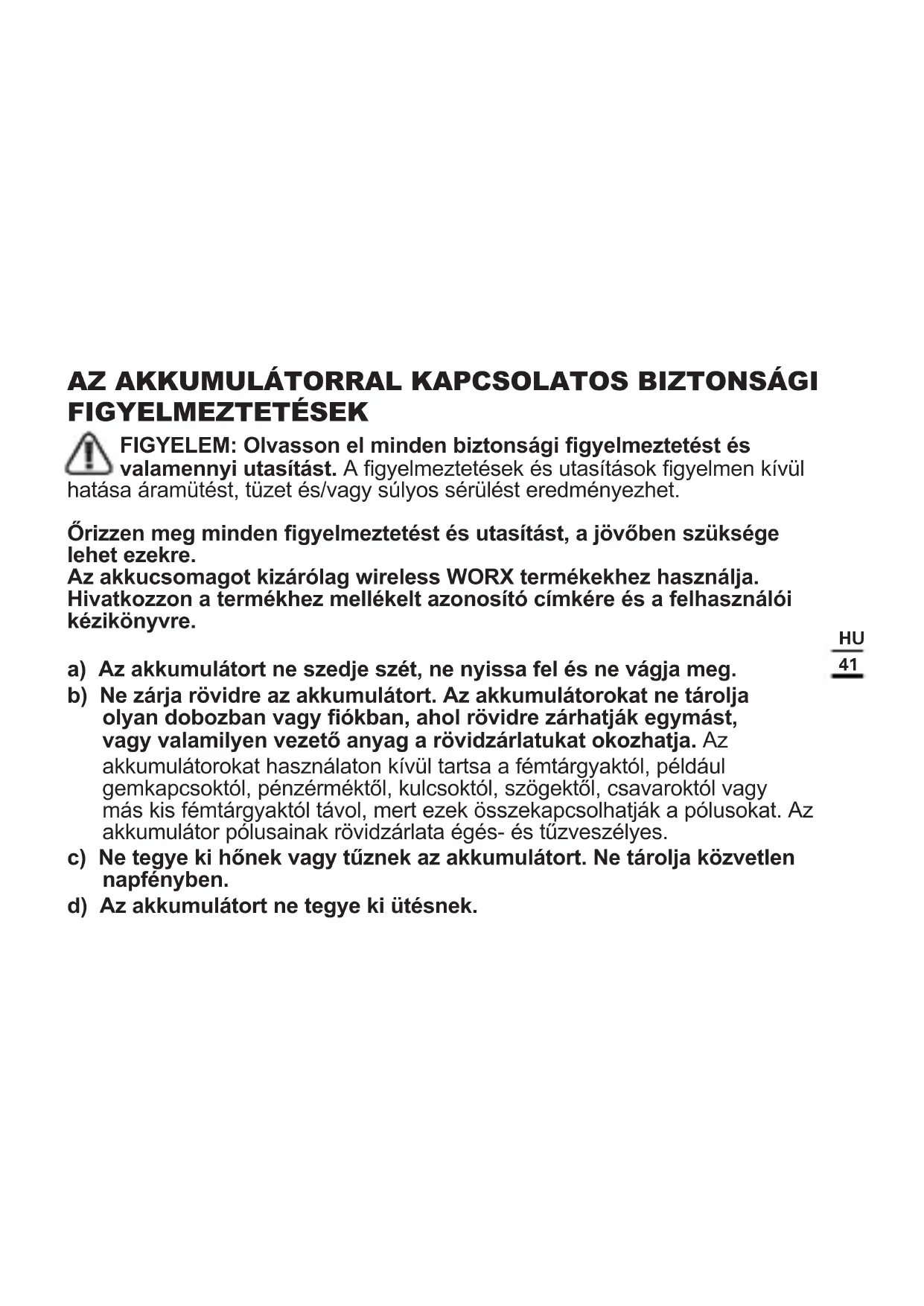 FIGYELMEZTETÉSEK FIGYELEM: Olvasson el minden biztonsági gyelmeztetést és valamennyi utasítást. A gyelmeztetések és utasítások gyelmen kívül hatása áramütést, tüzet és/vagy súlyos sérülést eredményezhet. Őrizzen meg minden gyelmeztetést és utasítást, a jövőben szüksége lehet ezekre. Az akkucsomagot kizárólag wireless WORX termékekhez használja. Hivatkozzon a termékhez mellékelt azonosító címkére és a felhasználói kézikönyvre. a) Az akkumulátort ne szedje szét, ne nyissa fel és ne vágja meg. b) Ne zárja rövidre az akkumulátort. Az akkumulátorokat ne tárolja olyan dobozban vagy ókban, ahol rövidre zárhatják egymást, vagy valamilyen vezető anyag a rövidzárlatukat okozhatja. Az akkumulátorokat használaton kívül tartsa a fémtárgyaktól, például gemkapcsoktól, pénzérméktől, kulcsoktól, szögektől, csavaroktól vagy más kis fémtárgyaktól távol, mert ezek összekapcsolhatják a pólusokat. Az akkumulátor pólusainak rövidzárlata égés- és tűzveszélyes. c) Ne tegye ki hőnek vagy tűznek az akkumulátort. Ne tárolja közvetlen napfényben. d) Az akkumulátort ne tegye ki ütésnek.42