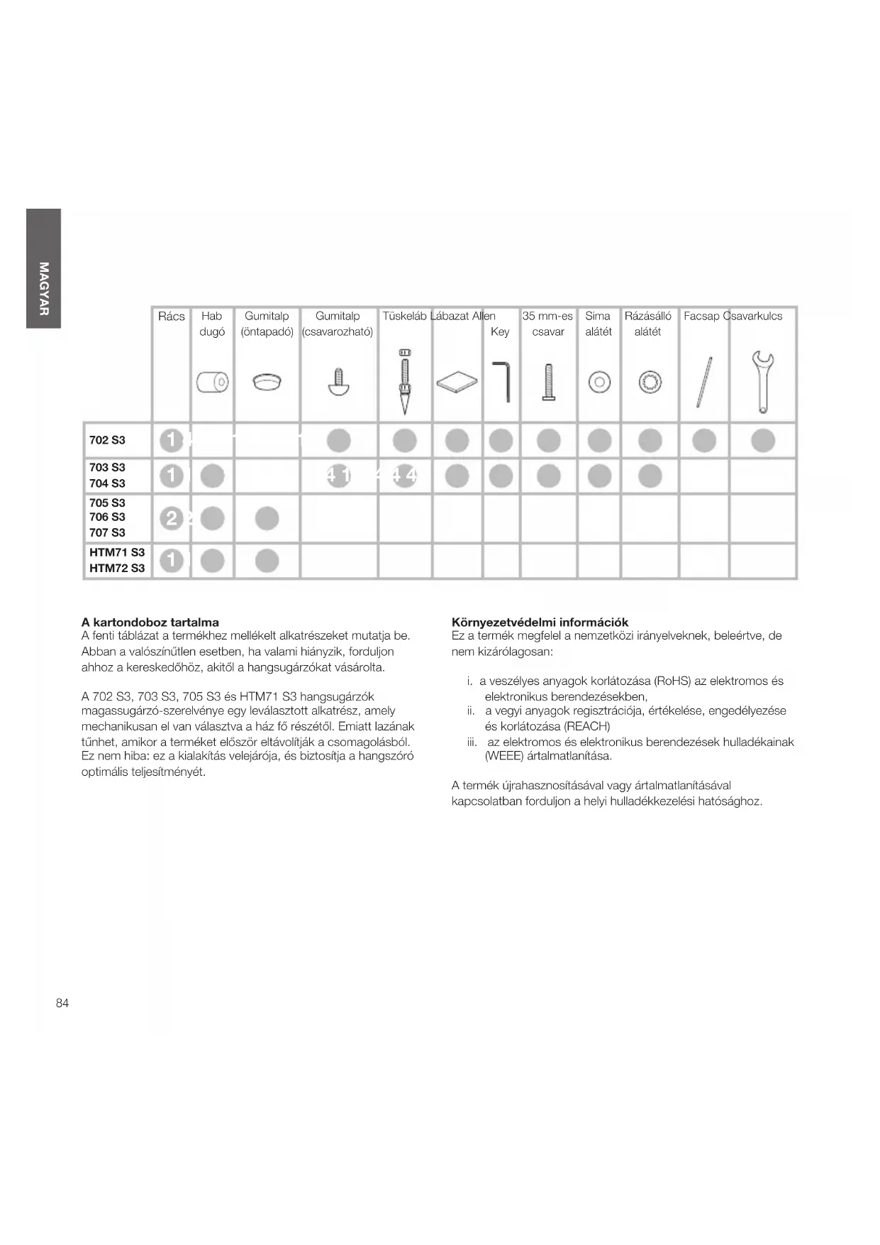 MAGYAR A kartondoboz tartalma A fenti táblázat a termékhez mellékelt alkatrészeket mutatja be. Abban a valószínűtlen esetben, ha valami hiányzik, forduljon ahhoz a kereskedőhöz, akitől a hangsugárzókat vásárolta. A 702 S3, 703 S3, 705 S3 és HTM71 S3 hangsugárzók magassugárzó-szerelvénye egy leválasztott alkatrész, amely mechanikusan el van választva a ház fő részétől. Emiatt lazának tűnhet, amikor a terméket először eltávolítják a csomagolásból. Ez nem hiba: ez a kialakítás velejárója, és biztosítja a hangszóró optimális teljesítményét. Környezetvédelmi információk Ez a termék megfelel a nemzetközi irányelveknek, beleértve, de nem kizárólagosan: