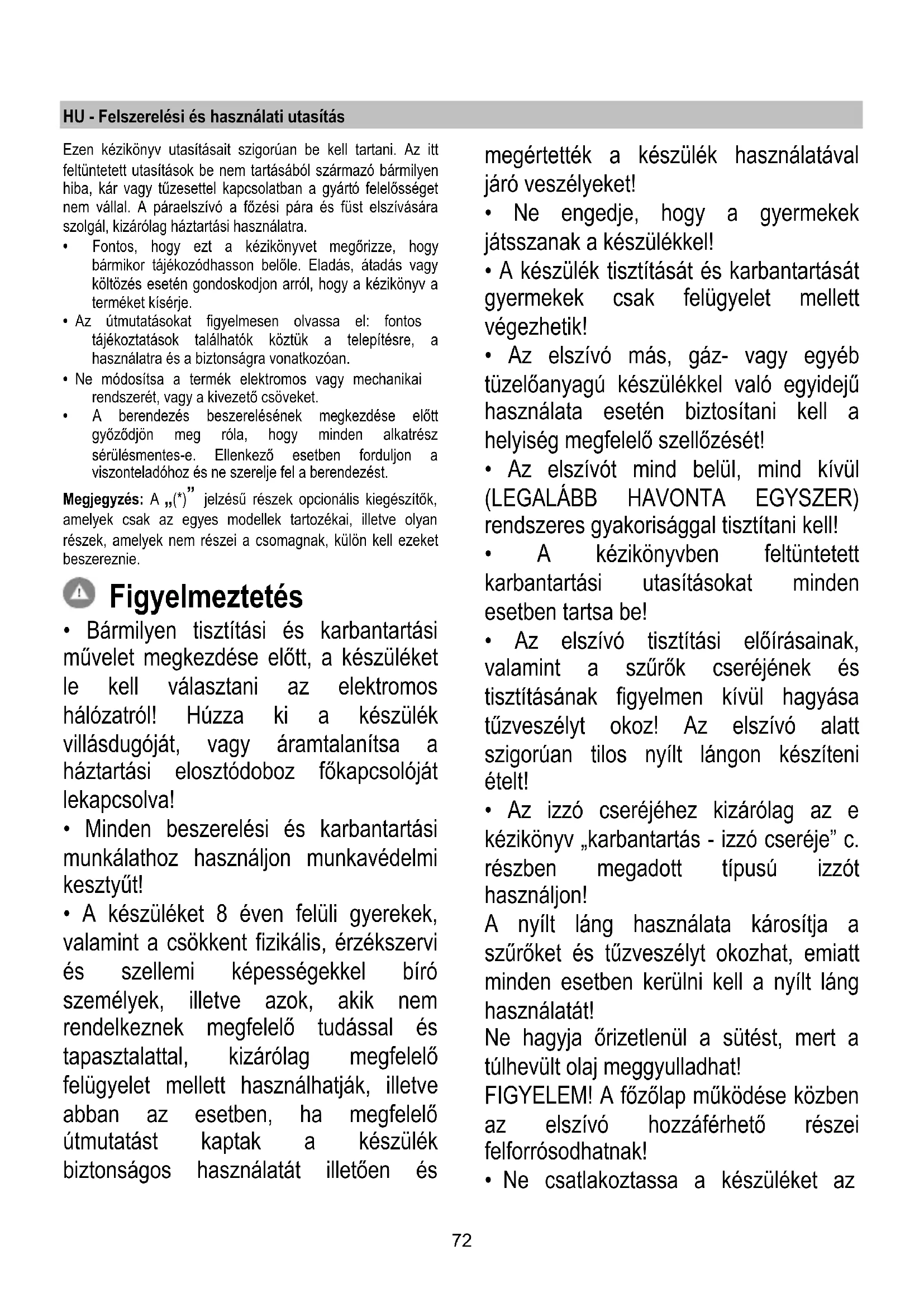 - Az izzó cseréjéhez kizárólag az e kézikönyv „karbantartás - izzó cseréje” c. részben megadott típusú izzót használjon! A nyílt láng használata károsítja a szűrőket és tűzveszélyt okozhat, emiatt minden esetben kerülni kell a nyílt láng használatát! Ne hagyja őrizetlenül a sütést, mert a túlhevült olaj meggyulladhat! FIGYELEM! A főzőlap működése közben az elszívó hozzáférhető részei felforrósodhatnak!