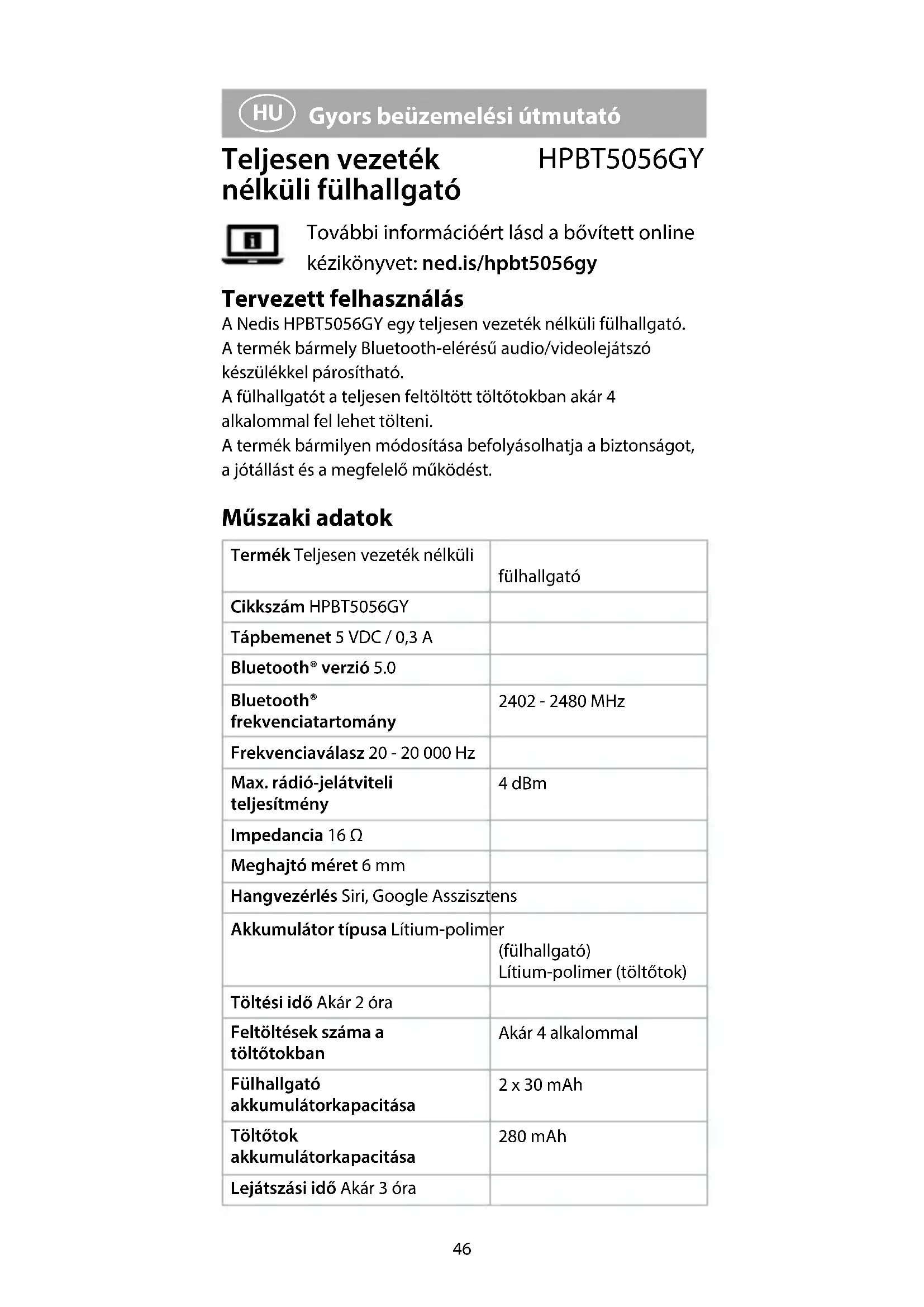 Találja meg az eszköz kézikönyvét ingyenesen HPBT5056GY NEDIS PDF formátumban.