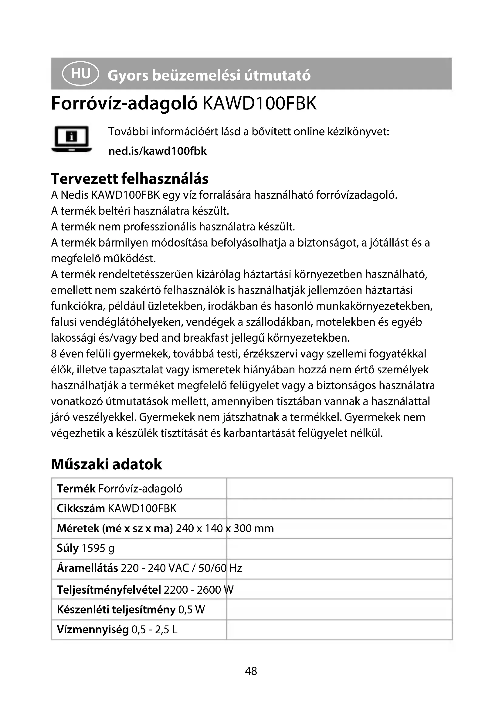 Találja meg az eszköz kézikönyvét ingyenesen KAWD100FBK NEDIS PDF formátumban.