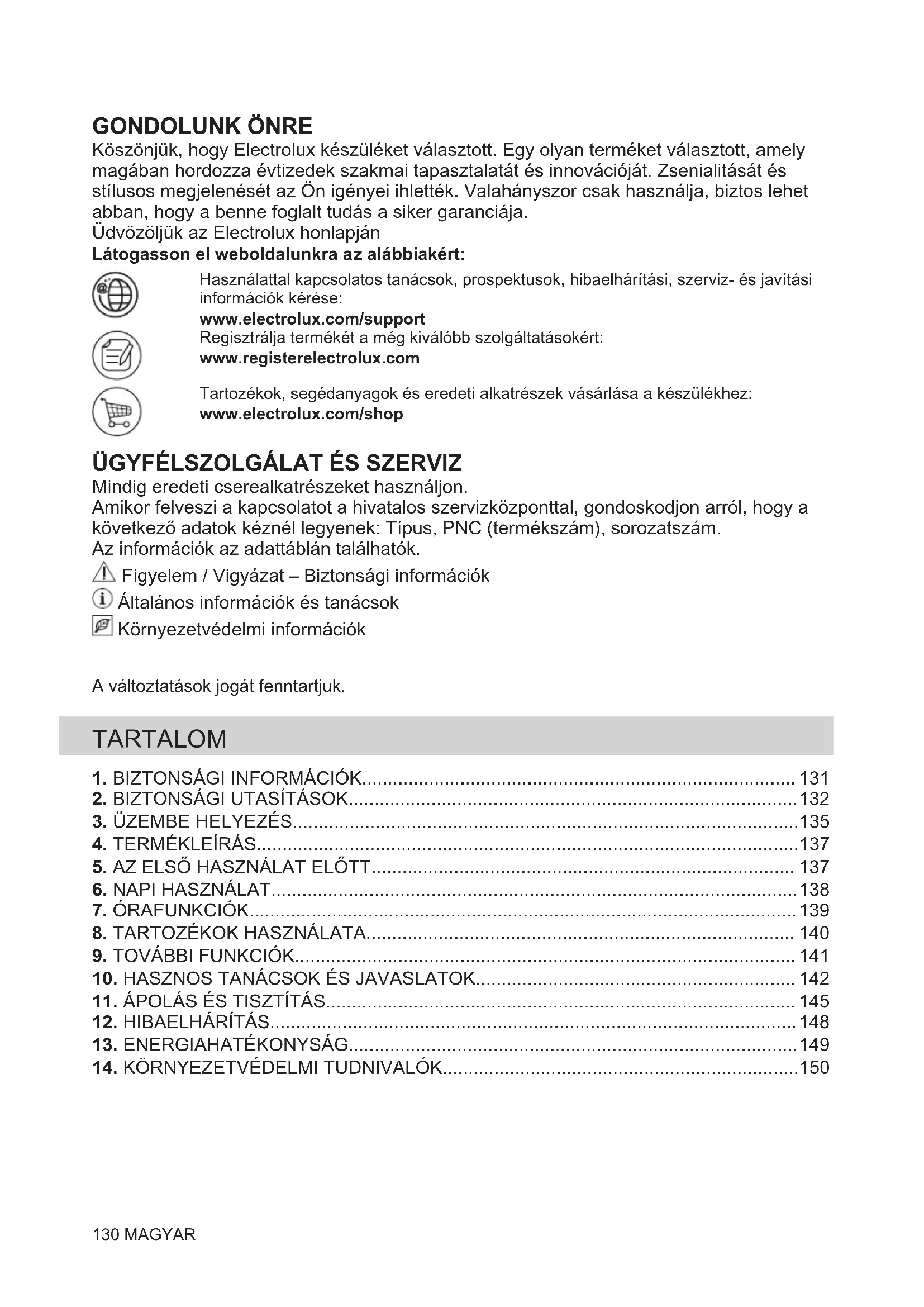Köszönjük, hogy Electrolux készüléket választott. Egy olyan terméket választott, amely magában hordozza évtizedek szakmai tapasztalatát és innovációját. Zsenialitását és stílusos megjelenését az Ön igényei ihlették. Valahányszor csak használja, biztos lehet abban, hogy a benne foglalt tudás a siker garanciája. Üdvözöljük az Electrolux honlapján Látogasson el weboldalunkra az alábbiakért: Használattal kapcsolatos tanácsok, prospektusok, hibaelhárítási, szerviz- és javítási információk kérése: www.electrolux.com/support Regisztrálja termékét a még kiválóbb szolgáltatásokért: www.registerelectrolux.com Tartozékok, segédanyagok és eredeti alkatrészek vásárlása a készülékhez: www.electrolux.com/shop