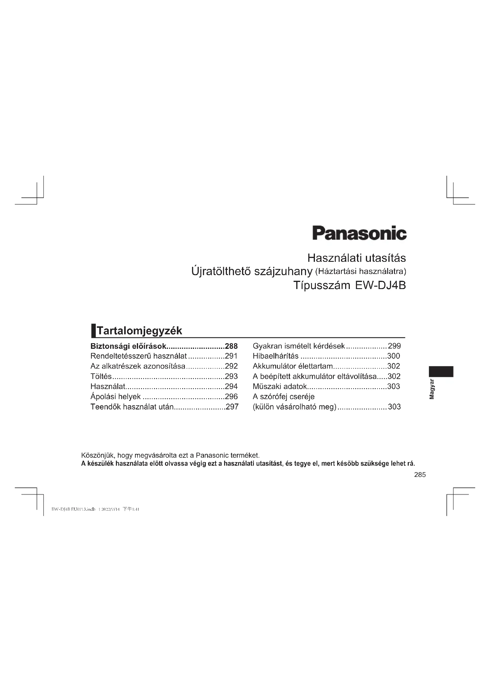 - EW-DJ4B EU0713.indb 20 2022/7/14 下午1:41285 Magyar Köszönjük, hogy megvásárolta ezt a Panasonic terméket.A készülék használata előtt olvassa végig ezt a használati utasítást, és tegye el, mert később szüksége lehet rá. Tartalomjegyzék Használati utasítás Újratölthető szájzuhany (Háztartási használatra) Típusszám EW-DJ4B Biztonsági előírások p. 288