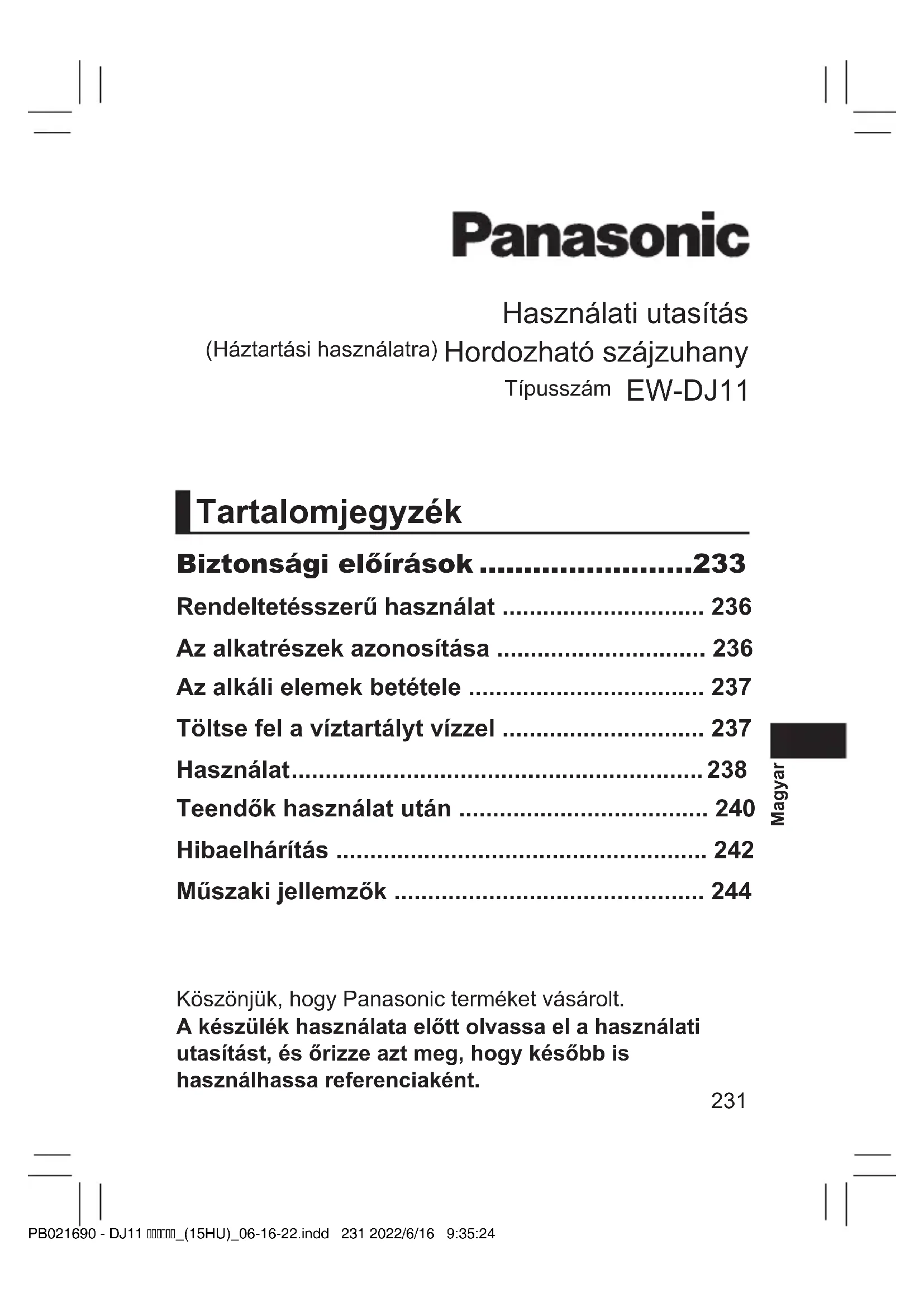 HASZNÁLATI ÚTMUTATÓ EWDJ11 PANASONIC