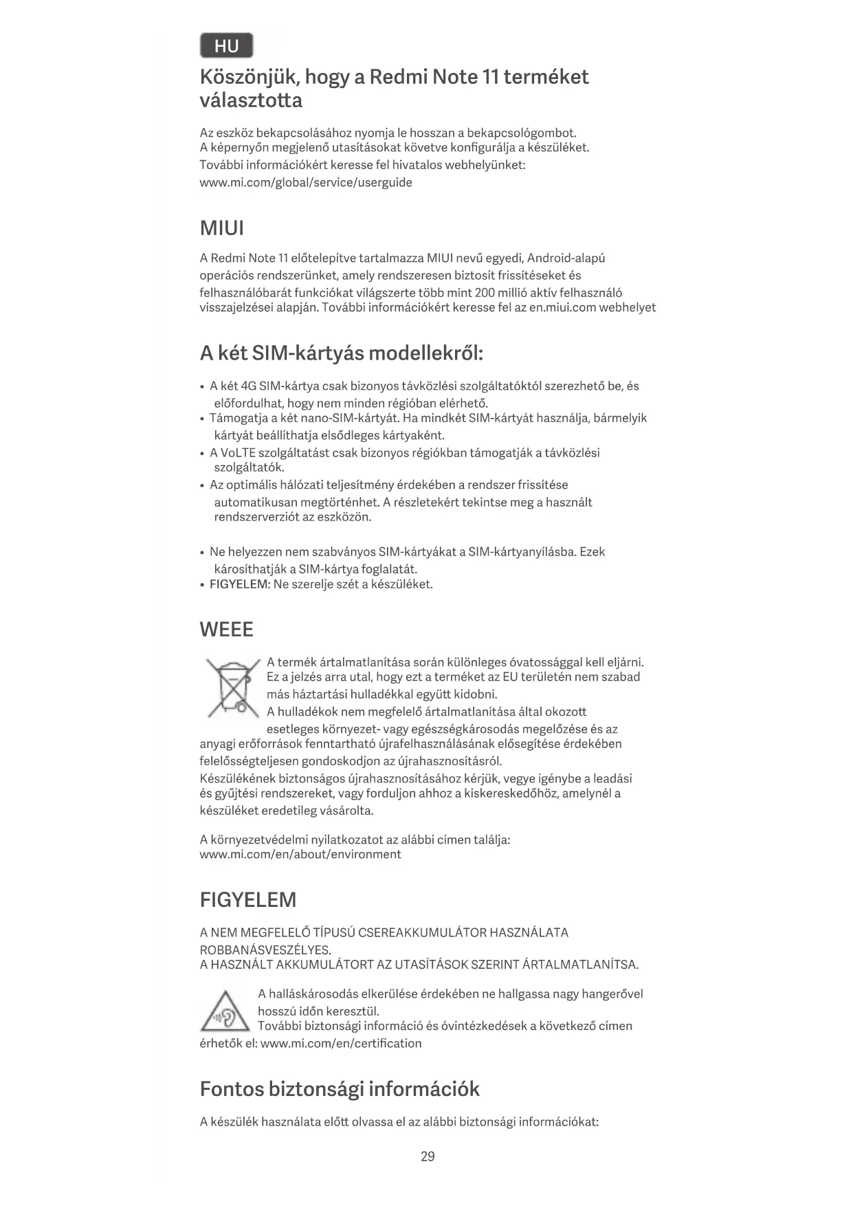- FIGYELEM: Ne szerelje szét a készüléket. WEEE A termék ártalmatlanítása során különleges óvatossággal kell eljárni. Ez a jelzés arra utal, hogy ezt a terméket az EU területén nem szabad más háztartási hulladékkal együ kidobni. A hulladékok nem megfelelő ártalmatlanítása által okozo esetleges környezet- vagy egészségkárosodás megelőzése és az anyagi erőforrások fenntartható újrafelhasználásának elősegítése érdekében felelősségteljesen gondoskodjon az újrahasznosításról. Készülékének biztonságos újrahasznosításához kérjük, vegye igénybe a leadási és gyűjtési rendszereket, vagy forduljon ahhoz a kiskereskedőhöz, amelynél a készüléket eredetileg vásárolta. A környezetvédelmi nyilatkozatot az alábbi címen találja: www.mi.com/en/about/environment FIGYELEM A NEM MEGFELELŐ TÍPUSÚ CSEREAKKUMULÁTOR HASZNÁLATA ROBBANÁSVESZÉLYES. A HASZNÁLT AKKUMULÁTORT AZ UTASÍTÁSOK SZERINT ÁRTALMATLANÍTSA. A halláskárosodás elkerülése érdekében ne hallgassa nagy hangerővel hosszú időn keresztül. További biztonsági információ és óvintézkedések a következő címen érhetők el: www.mi.com/en/certification Fontos biztonsági információk A készülék használata elő olvassa el az alábbi biztonsági információkat: 29• Jóváhagyás nélküli kábelek, tápegységek vagy akkumulátorok használata tüzet vagy robbanást okozhat, illetve egyéb kockázatokkal járhat.