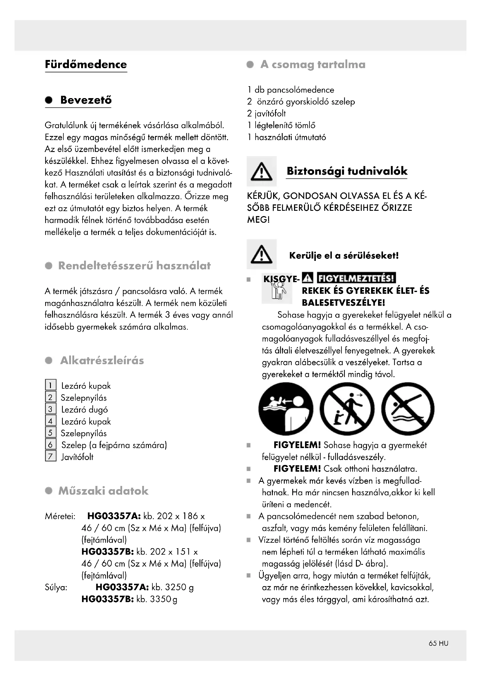Javítófolt Műszaki adatok Méretei: HG03357A: kb. 202 x 186 x 46 / 60 cm (Sz x Mé x Ma) (felfújva) (fejtámlával) HG03357B: kb. 202 x 151 x 46 / 60 cm (Sz x Mé x Ma) (felfújva) (fejtámlával) Súlya: HG03357A: kb. 3250 g HG03357B: kb. 3350 g A csomag tartalma 1 db pancsolómedence 2 önzáró gyorskioldó szelep 2 javítófolt 1 légtelenítő tömlő 1 használati útmutató Biztonsági tudnivalók KÉRJÜK, GONDOSAN OLVASSA EL ÉS A KÉ- SŐBB FELMERÜLŐ KÉRDÉSEIHEZ ŐRIZZE MEG! Kerülje el a sérüléseket! KISGYE-