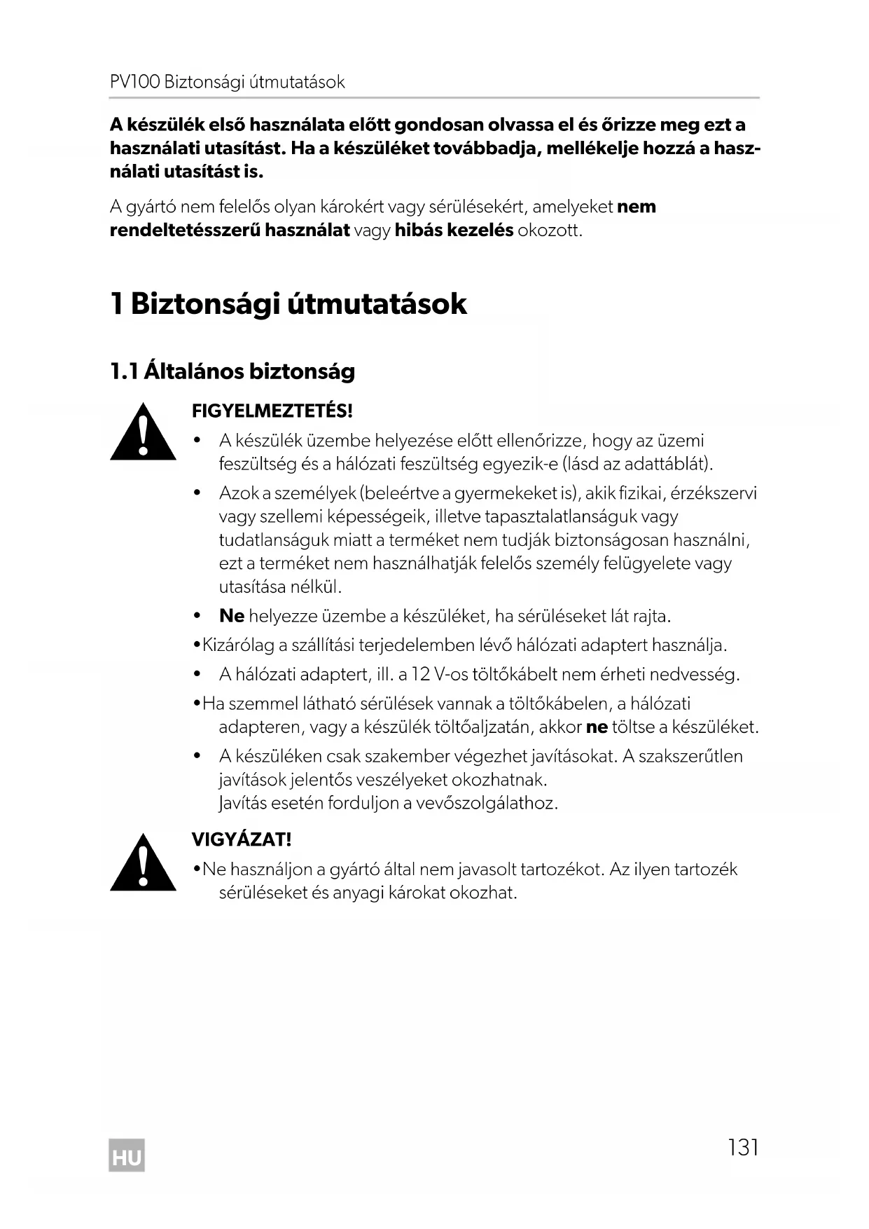 - Ne használjon a gyártó által nem javasolt tartozékot. Az ilyen tartozék sérüléseket és anyagi károkat okozhat. PV100-O-16s.book Seite 131 Montag, 29. August 2016 3:47 15HU Biztonsági útmutatások PV100