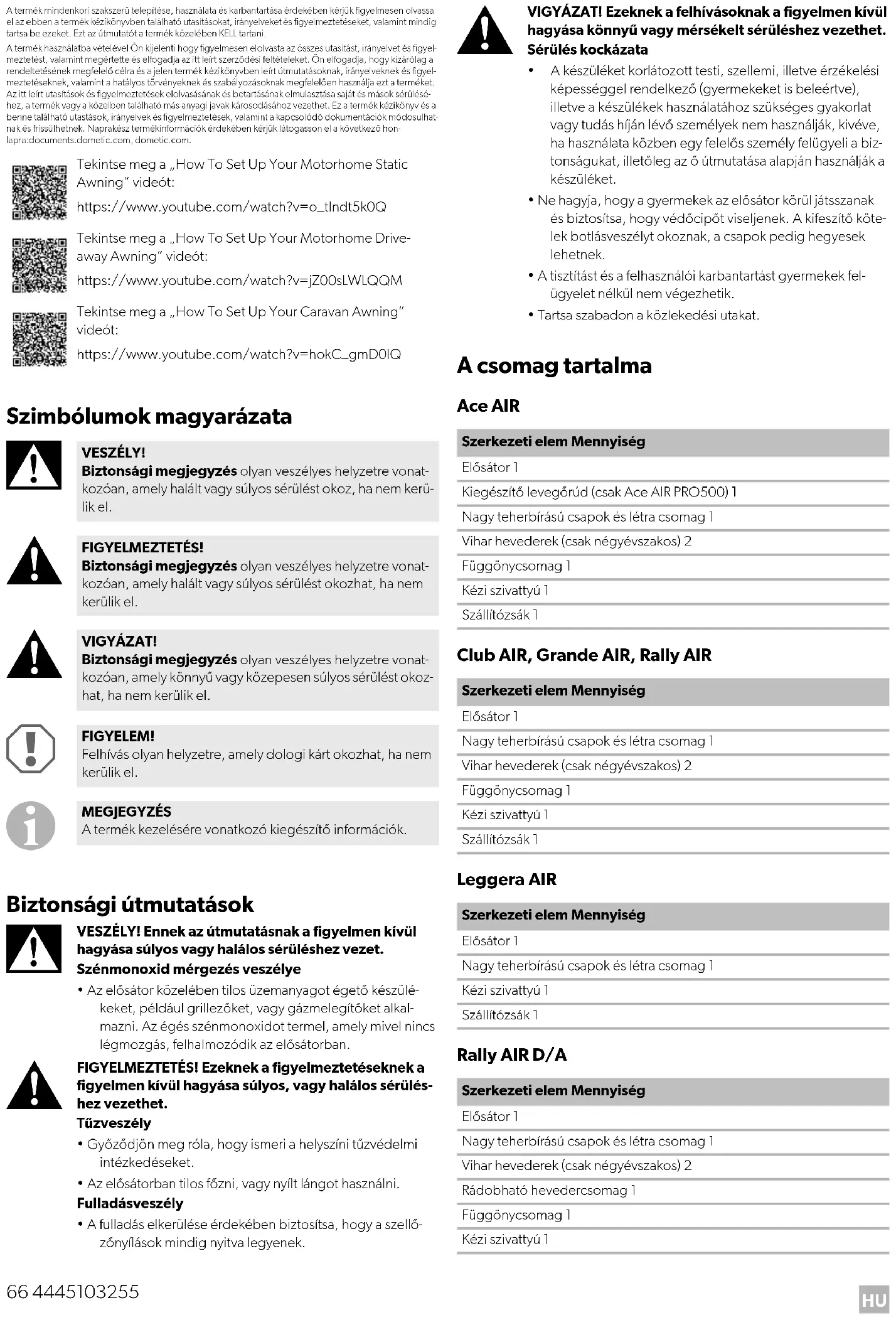 - Tartsa szabadon a közlekedési utakat. A csomag tartalma Ace AIR Club AIR, Grande AIR, Rally AIR Leggera AIR Rally AIR D/A Tekintse meg a „How To Set Up Your Motorhome Static Awning” videót: https://www.youtube.com/watch?v=o_tIndt5k0Q Tekintse meg a „How To Set Up Your Motorhome Drive- away Awning” videót: https://www.youtube.com/watch?v=jZ00sLWLQQM Tekintse meg a „How To Set Up Your Caravan Awning” videót: https://www.youtube.com/watch?v=hokC_gmD0lQ VESZÉLY! Biztonsági megjegyzés olyan veszélyes helyzetre vonat- kozóan, amely halált vagy súlyos sérülést okoz, ha nem kerü- lik el. FIGYELMEZTETÉS! Biztonsági megjegyzés olyan veszélyes helyzetre vonat- kozóan, amely halált vagy súlyos sérülést okozhat, ha nem kerülik el. VIGYÁZAT! Biztonsági megjegyzés olyan veszélyes helyzetre vonat- kozóan, amely könnyű vagy közepesen súlyos sérülést okoz- hat, ha nem kerülik el. FIGYELEM! Felhívás olyan helyzetre, amely dologi kárt okozhat, ha nem kerülik el. MEGJEGYZÉS A termék kezelésére vonatkozó kiegészítő információk. Szerkezeti elem Mennyiség Elősátor 1 Kiegészítő levegőrúd (csak Ace AIR PRO500) 1 Nagy teherbírású csapok és létra csomag 1 Vihar hevederek (csak négyévszakos) 2 Függönycsomag 1 Kézi szivattyú 1 Szállítózsák 1 Szerkezeti elem Mennyiség Elősátor 1 Nagy teherbírású csapok és létra csomag 1 Vihar hevederek (csak négyévszakos) 2 Függönycsomag 1 Kézi szivattyú 1 Szállítózsák 1 Szerkezeti elem Mennyiség Elősátor 1 Nagy teherbírású csapok és létra csomag 1 Kézi szivattyú 1 Szállítózsák 1 Szerkezeti elem Mennyiség Elősátor 1 Nagy teherbírású csapok és létra csomag 1 Vihar hevederek (csak négyévszakos) 2 Rádobható hevedercsomag 1 Függönycsomag 1 Kézi szivattyú 1HU