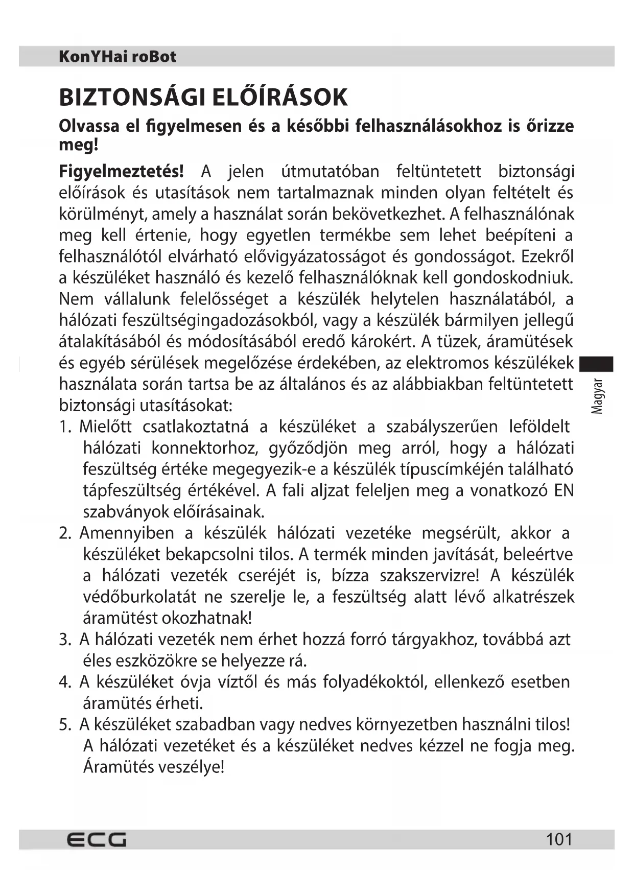 A papírt és a hullámpapírt dobja a papírgyűjtő konténerbe. A műanyag fóliákat, PE zacskót és egyéb műanyag csomagolóanyagokat a műanyag gyűjtő konténerbe dobja ki. A TERMÉK MEGSEMMISÍTÉSE AZ ÉLETTARTAMA VÉGÉN Az elektromos és elektronikus hulladékok kezelésére vonatkozó információk (érvényes az EU tagországokban és a hulladékok szelektálását előíró országokban) A terméken, vagy a termék csomagolóanyagán feltüntetett jel azt jelenti, hogy az elektromos és elektronikus készüléket a háztartási hulladékok közé kidobni tilos. A terméket az elektromos és elektronikus hulladékok gyűjtésére kijelölt hulladékgyűjtő helyen kell leadni újrahasznosításhoz. Az elhasználódott termék előírásszerű újrafeldolgozásával Ön is hozzájárul a környezetünk védelméhez. A hulladékok megfelelő újrahasznosítása fontos szerepet játszik a természeti erőforrások kímélésében. A termék hulladékgyűjtőbe való leadásáról, és az anyagok újrahasznosításáról további információkat a polgármesteri hivatalban, a hulladékgyűjtő helyen, vagy a termék eladási helyén kaphat. Ez a termék megfelel a kisfeszültségű berendezések biztonságára és az elektromágneses kompatibilitásra vonatkozó EU irányelveknek. A termék megfelel az elektromos készülékek nehézfém tartalmára vonatkozó követelményeknek is. A készülék megfelel a vonatkozó energiahatékonysági előírásoknak, valamint az élelmiszerekkel közvetlenül kapcsolatba kerülő termékekre vonatkozó előírásoknak. A használati útmutatót a www.ecg-electro.eu honlapról töltheti le. A szöveg és a műszaki paraméterek megváltoztatásának a joga fenntartva. 08/05Polski Polski