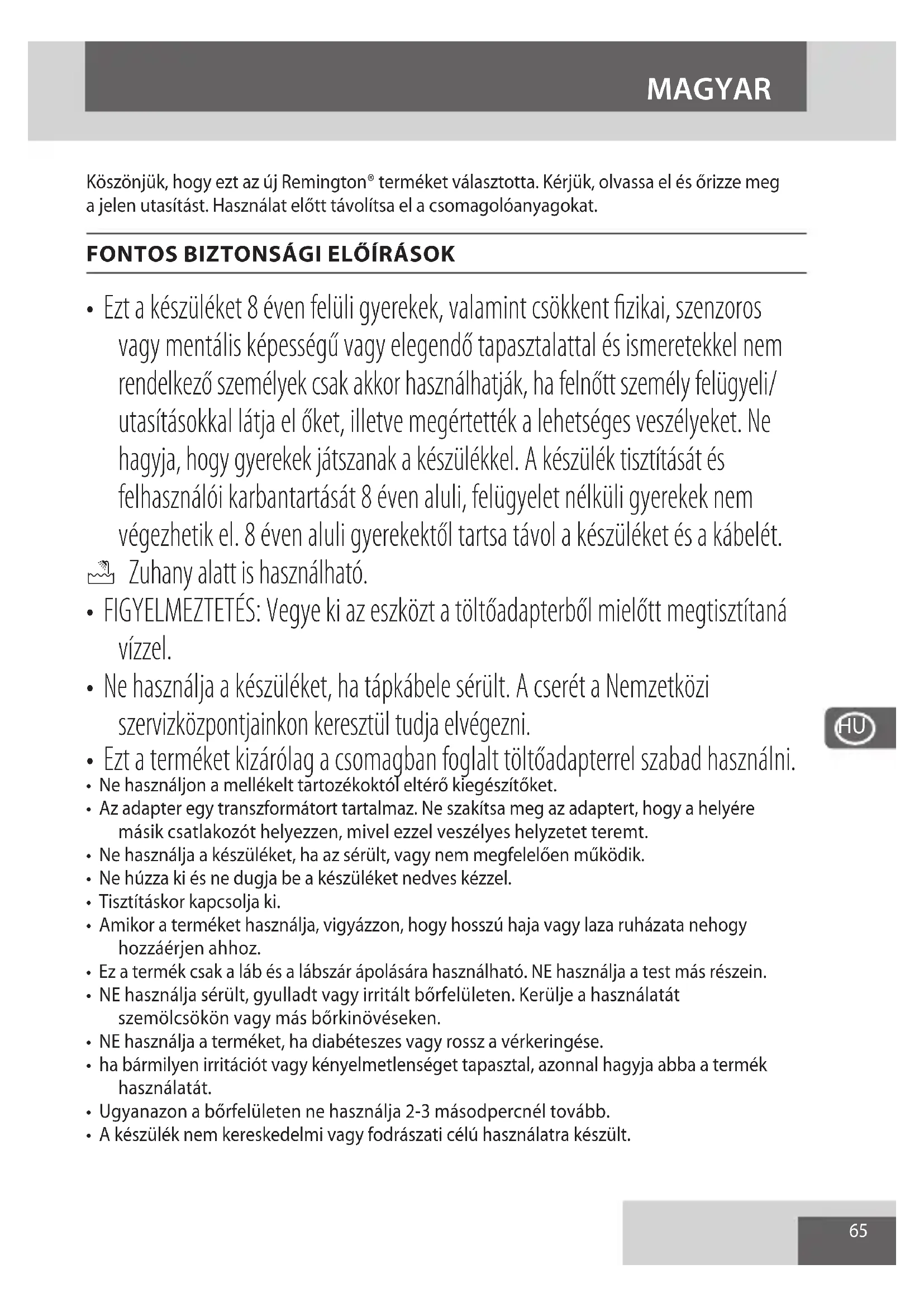 - Ne használjon a mellékelt tartozékoktól eltérő kiegészítőket.• Az adapter egy transzformátort tartalmaz. Ne szakítsa meg az adaptert, hogy a helyére másik csatlakozót helyezzen, mivel ezzel veszélyes helyzetet teremt.• Ne használja a készüléket, ha az sérült, vagy nem megfelelően működik.• Ne húzza ki és ne dugja be a készüléket nedves kézzel.• Tisztításkor kapcsolja ki.• Amikor a terméket használja, vigyázzon, hogy hosszú haja vagy laza ruházata nehogy hozzáérjen ahhoz.• Ez a termék csak a láb és a lábszár ápolására használható. NE használja a test más részein.• NE használja sérült, gyulladt vagy irritált bőrfelületen. Kerülje a használatát szemölcsökön vagy más bőrkinövéseken. • NE használja a terméket, ha diabéteszes vagy rossz a vérkeringése.• ha bármilyen irritációt vagy kényelmetlenséget tapasztal, azonnal hagyja abba a termék használatát.• Ugyanazon a bőrfelületen ne használja 2-3 másodpercnél tovább.• A készülék nem kereskedelmi vagy fodrászati célú használatra készült. MAGYAR
