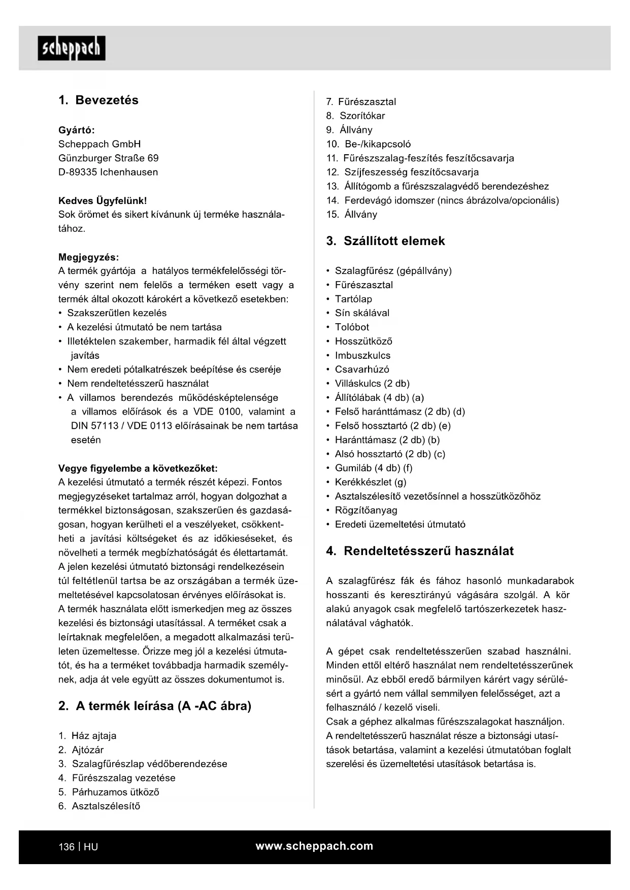 Gyártó: Scheppach GmbH Günzburger Straße 69 D-89335 Ichenhausen Kedves Ügyfelünk! Sok örömet és sikert kívánunk új terméke használa- tához. Megjegyzés: A termék gyártója a hatályos termékfelelősségi tör- vény szerint nem felelős a terméken esett vagy a termék által okozott károkért a következő esetekben: