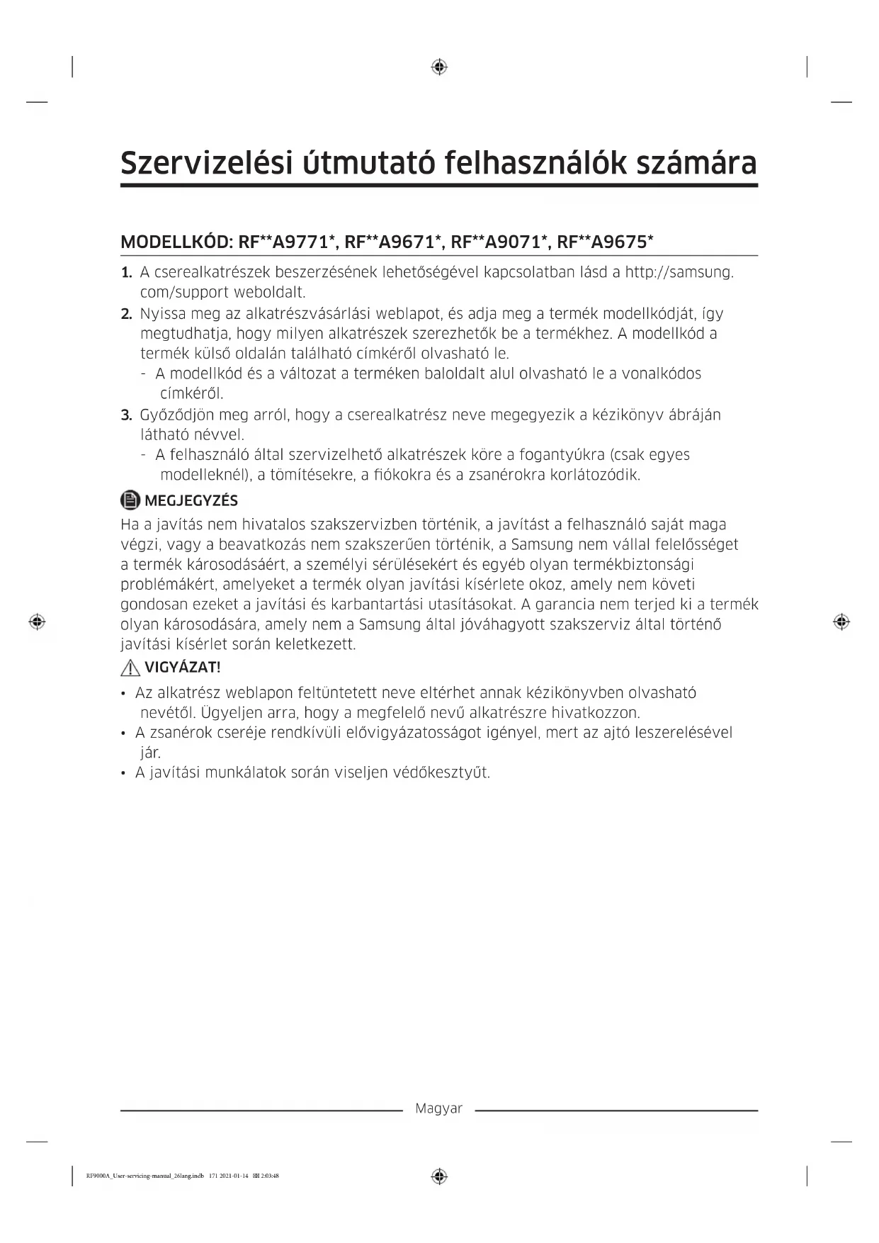 - A javítási munkálatok során viseljen védőkesztyűt. RF9000A_User-servicing-manual_26lang.indb 171 2021-01-14 2:03:48Magyar A hűtőszekrény kinézete és kínált alkatrészeinek köre a modelltől és az országtól függően eltérő lehet.