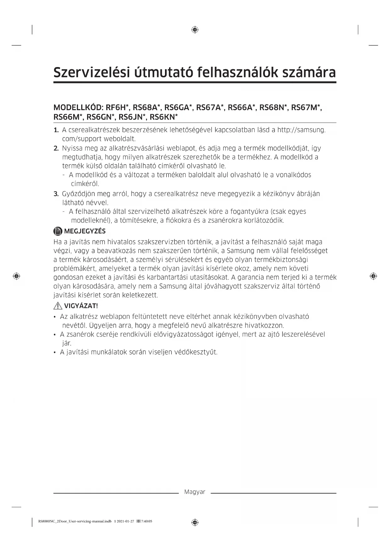 - A javítási munkálatok során viseljen védőkesztyűt. RS8000NC_2Door_User-servicing-manual.indb 1 2021-01-27 7:40:05Magyar A hűtőszekrény kinézete és kínált alkatrészeinek köre a modelltől és az országtól függően eltérő lehet.