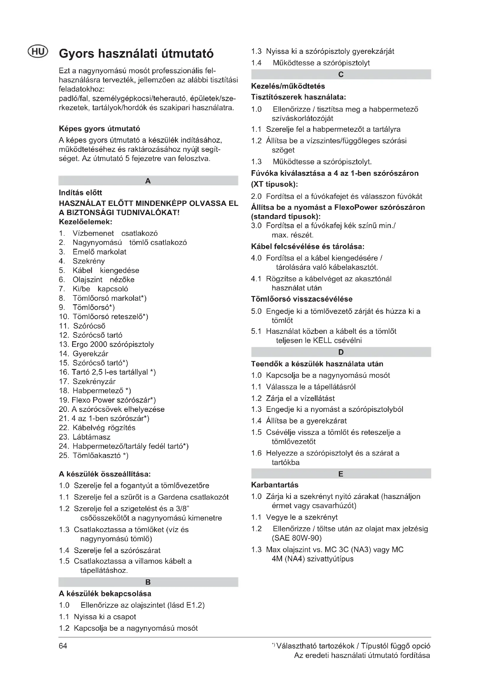 Gyors használati útmutató Ezt a nagynyomású mosót professzionális fel- használásra tervezték, jellemzően az alábbi tisztítási feladatokhoz: padló/fal, személygépkocsi/teherautó, épületek/sze- rkezetek, tartályok/hordók és szakipari használatra. Képes gyors útmutató A képes gyors útmutató a készülék indításához, működtetéséhez és raktározásához nyújt segít- séget. Az útmutató 5 fejezetre van felosztva.