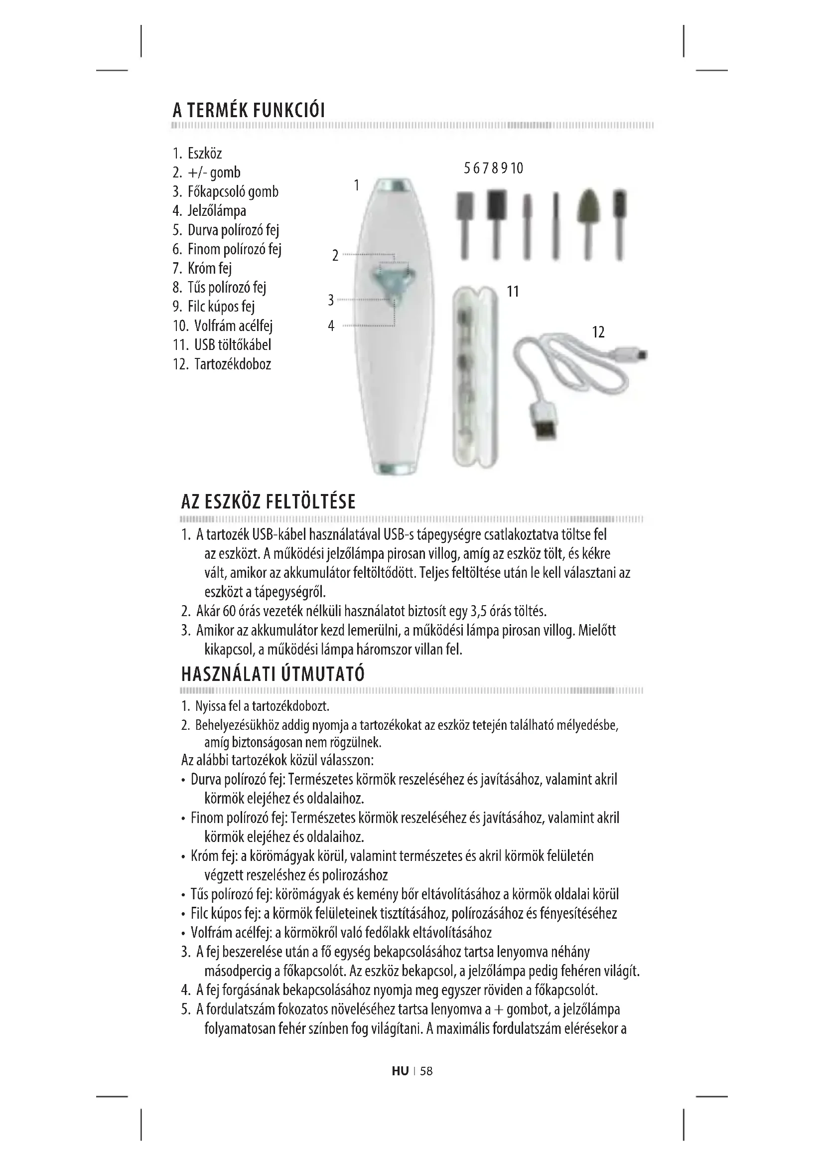 - Króm fej: a körömágyak körül, valamint természetes és akril körmök felületén végzett reszeléshez és polirozáshoz