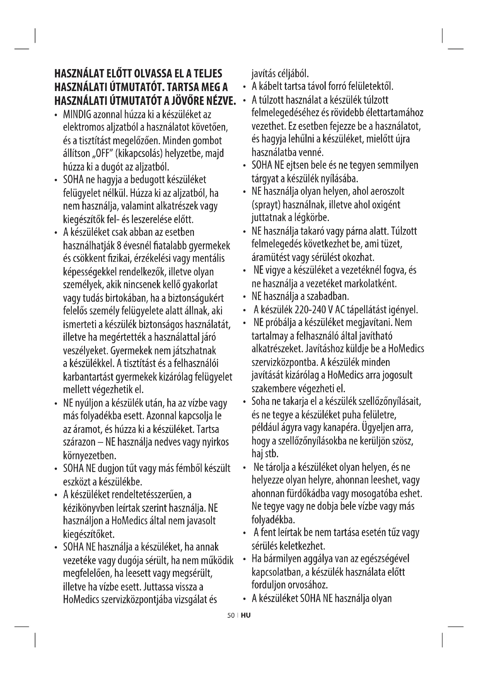 - A készüléket rendeltetésszerűen, a kézikönyvben leírtak szerint használja. NE használjon a HoMedics által nem javasolt kiegészítőket.