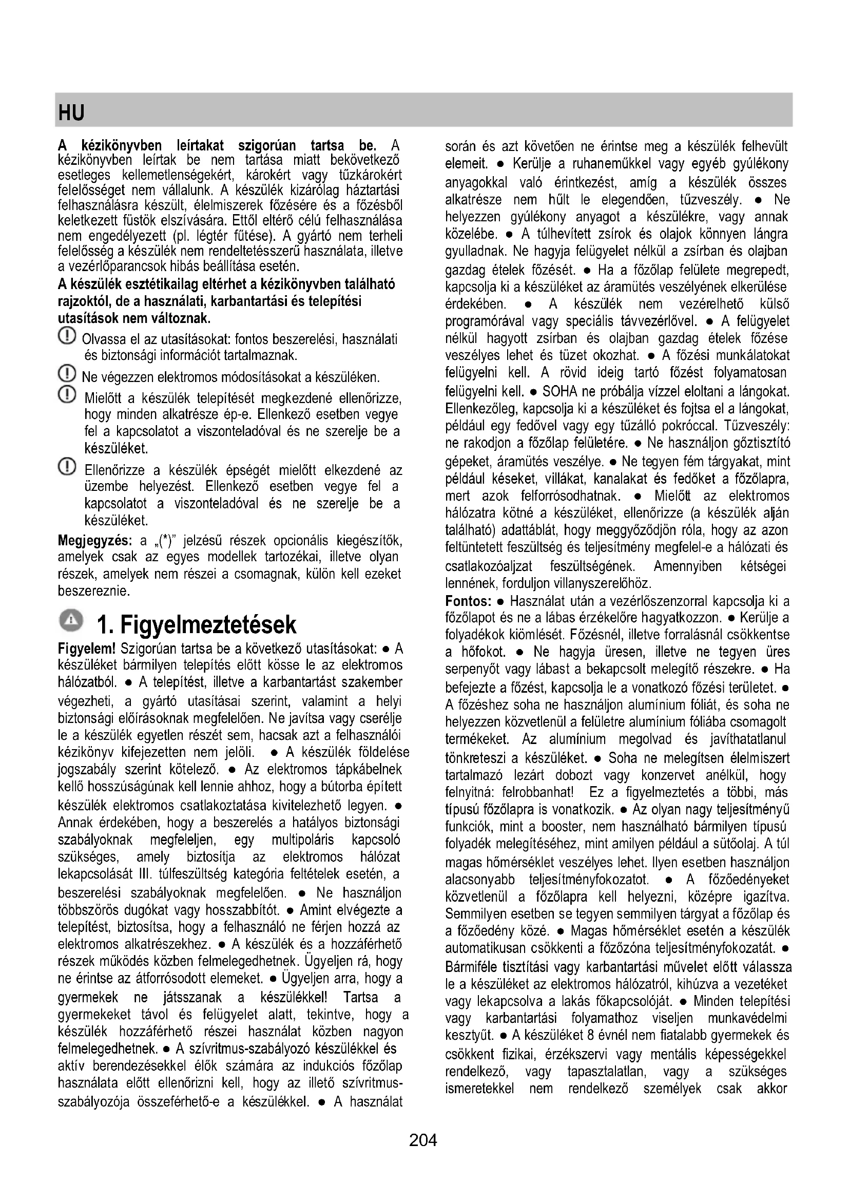 Figyelem! Szigorúan tartsa be a következő utasításokat: ● A készüléket bármilyen telepítés előtt kösse le az elektromos hálózatból. ● A telepítést, illetve a karbantartást szakember végezheti, a gyártó utasításai szerint, valamint a helyi biztonsági előírásoknak megfelelően. Ne javítsa vagy cserélje le a készülék egyetlen részét sem, hacsak azt a felhasználói kézikönyv kifejezetten nem jelöli. ● A készülék földelése jogszabály szerint kötelező. ● Az elektromos tápkábelnek kellő hosszúságúnak kell lennie ahhoz, hogy a bútorba épített készülék elektromos csatlakoztatása kivitelezhető legyen. ● Annak érdekében, hogy a beszerelés a hatályos biztonsági szabályoknak megfeleljen, egy multipoláris kapcsoló szükséges, amely biztosítja az elektromos hálózat lekapcsolását III. túlfeszültség kategória feltételek esetén, a beszerelési szabályoknak megfelelően. ● Ne használjon többszörös dugókat vagy hosszabbítót. ● Amint elvégezte a telepítést, biztosítsa, hogy a felhasználó ne férjen hozzá az elektromos alkatrészekhez. ● A készülék és a hozzáférhető részek működés közben felmelegedhetnek. Ügyeljen rá, hogy ne érintse az átforrósodott elemeket. ● Ügyeljen arra, hogy a gyermekek ne játsszanak a készülékkel! Tartsa a gyermekeket távol és felügyelet alatt, tekintve, hogy a készülék hozzáférhető részei használat közben nagyon felmelegedhetnek. ● A szívritmus-szabályozó készülékkel és aktív berendezésekkel élők számára az indukciós főzőlap használata előtt ellenőrizni kell, hogy az illető szívritmus- szabályozója összeférhető-e a készülékkel. ● A használat során és azt követően ne érintse meg a készülék felhevült elemeit. ● Kerülje a ruhaneműkkel vagy egyéb gyúlékony anyagokkal való érintkezést, amíg a készülék összes alkatrésze nem hűlt le elegendően, tűzveszély. ● Ne helyezzen gyúlékony anyagot a készülékre, vagy annak közelébe. ● A túlhevített zsírok és olajok könnyen lángra gyulladnak. Ne hagyja felügyelet nélkül a zsírban és olajban gazdag ételek főzését. ● Ha a főzőlap felülete megrepedt, kapcsolja ki a készüléket az áramütés veszélyének elkerülése érdekében. ● A készülék nem vezérelhető külső programórával vagy speciális távvezérlővel. ● A felügyelet nélkül hagyott zsírban és olajban gazdag ételek főzése veszélyes lehet és tüzet okozhat. ● A főzési munkálatokat felügyelni kell. A rövid ideig tartó főzést folyamatosan felügyelni kell. ● SOHA ne próbálja vízzel eloltani a lángokat. Ellenkezőleg, kapcsolja ki a készüléket és fojtsa el a lángokat, például egy fedővel vagy egy tűzálló pokróccal. Tűzveszély: ne rakodjon a főzőlap felületére. ● Ne használjon gőztisztító gépeket, áramütés veszélye. ● Ne tegyen fém tárgyakat, mint például késeket, villákat, kanalakat és fedőket a főzőlapra, mert azok felforrósodhatnak. ● Mielőtt az elektromos hálózatra kötné a készüléket, ellenőrizze (a készülék alján található) adattáblát, hogy meggyőződjön róla, hogy az azon feltüntetett feszültség és teljesítmény megfelel-e a hálózati és csatlakozóaljzat feszültségének. Amennyiben kétségei lennének, forduljon villanyszerelőhöz. Fontos: ● Használat után a vezérlőszenzorral kapcsolja ki a főzőlapot és ne a lábas érzékelőre hagyatkozzon. ● Kerülje a folyadékok kiömlését. Főzésnél, illetve forralásnál csökkentse a hőfokot. ● Ne hagyja üresen, illetve ne tegyen üres serpenyőt vagy lábast a bekapcsolt melegítő részekre. ● Ha befejezte a főzést, kapcsolja le a vonatkozó főzési területet. ● A főzéshez soha ne használjon alumínium fóliát, és soha ne helyezzen közvetlenül a felületre alumínium fóliába csomagolt termékeket. Az alumínium megolvad és javíthatatlanul tönkreteszi a készüléket. ● Soha ne melegítsen élelmiszert tartalmazó lezárt dobozt vagy konzervet anélkül, hogy felnyitná: felrobbanhat! Ez a figyelmeztetés a többi, más típusú főzőlapra is vonatkozik. ● Az olyan nagy teljesítményű funkciók, mint a booster, nem használható bármilyen típusú folyadék melegítéséhez, mint amilyen például a sütőolaj. A túl magas hőmérséklet veszélyes lehet. Ilyen esetben használjon alacsonyabb teljesítményfokozatot. ● A főzőedényeket közvetlenül a főzőlapra kell helyezni, középre igazítva. Semmilyen esetben se tegyen semmilyen tárgyat a főzőlap és a főzőedény közé. ● Magas hőmérséklet esetén a készülék automatikusan csökkenti a főzőzóna teljesítményfokozatát. ● Bármiféle tisztítási vagy karbantartási művelet elő tt válassza le a készüléket az elektromos hálózatról, kihúzva a vezetéket vagy lekapcsolva a lakás főkapcsolóját. ● Minden telepítési vagy karbantartási folyamathoz viseljen munkavédelmi kesztyűt. ● A készüléket 8 évnél nem fiatalabb gyermekek és csökkent fizikai, érzékszervi vagy mentális képességekkel rendelkező, vagy tapasztalatlan, vagy a szükséges ismeretekkel nem rendelkező személyek csak akkor205 használhatják, ha felügyelet alatt vannak vagy ha megkapták a készülék biztonságos használatával és a benne rejlő veszélyek megértésével kapcsolatos utasításokat. ● Ellenőrizze, hogy a gyerekek ne játszanak a készülékkel. ● A tisztítási és karbantartási műveleteket gyermekek csak felügyelet mellett végezhetik. ● A helyiségben megfelelő szellőztetés legyen, amikor a készüléket más gáz● vagy tüzelőberendezéssel egyidejűleg használja. ● A készüléket gyakran tisztítsa mind belül, mind kívül (LEGALÁBB HAVI EGYSZER), mindenképp tartsa be a karbantartási utasításokban leírtakat. ● A készülék tiszt