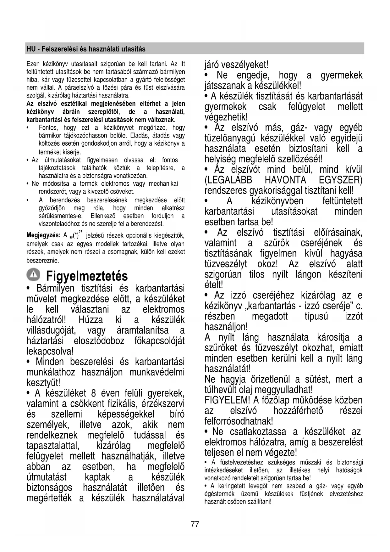 - Az izzó cseréjéhez kizárólag az e kézikönyv „karbantartás - izzó cseréje” c. részben megadott típusú izzót használjon! A nyílt láng használata károsítja a szűrőket és tűzveszélyt okozhat, emiatt minden esetben kerülni kell a nyílt láng használatát! Ne hagyja őrizetlenül a sütést, mert a túlhevült olaj meggyulladhat! FIGYELEM! A főzőlap működése közben az elszívó hozzáférhető részei felforrósodhatnak!