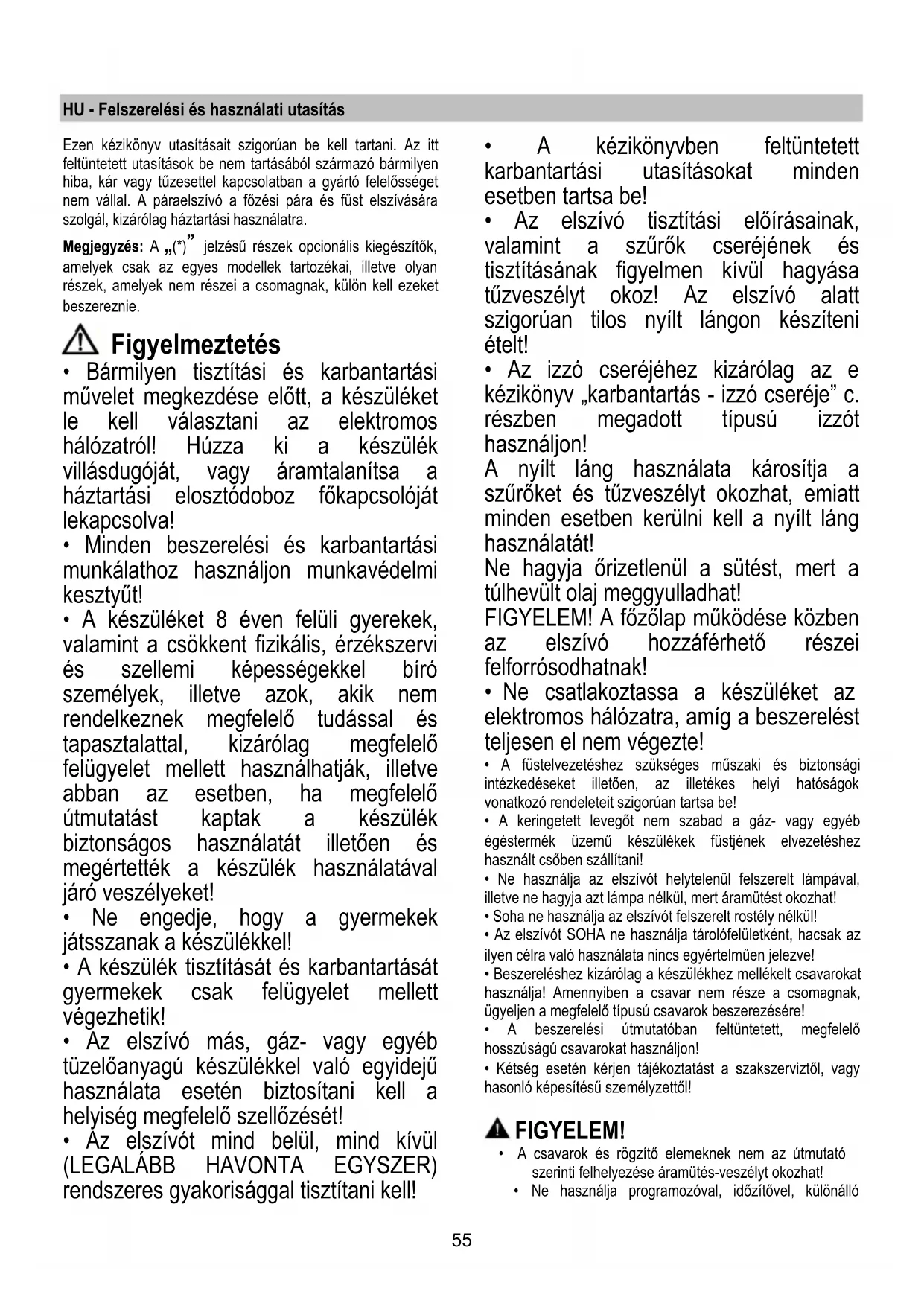 - Az elszívó tisztítási előírásainak, valamint a szűrők cseréjének és tisztításának figyelmen kívül hagyása tűzveszélyt okoz! Az elszívó alatt szigorúan tilos nyílt lángon készíteni ételt!