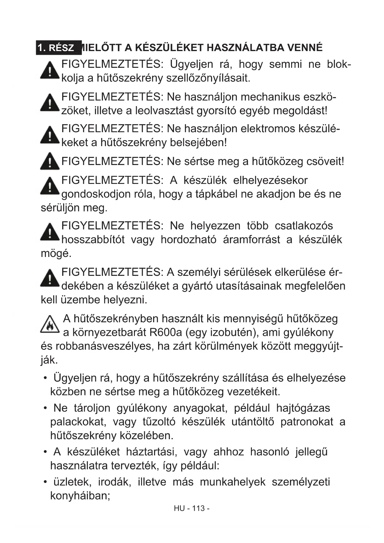 Energiatakarékossági tippek ..........................................................................131 A KÉSZÜLÉK RÉSZEI ÉS TARTOZÉKAI ............................................. 132HU - 113 - FIGYELMEZTETÉS: Ügyeljen rá, hogy semmi ne blok- kolja a hűtőszekrény szellőzőnyílásait. FIGYELMEZTETÉS: Ne használjon mechanikus eszkö- zöket, illetve a leolvasztást gyorsító egyéb megoldást! FIGYELMEZTETÉS: Ne használjon elektromos készülé- keket a hűtőszekrény belsejében! FIGYELMEZTETÉS: Ne sértse meg a hűtőközeg csöveit! FIGYELMEZTETÉS: A készülék elhelyezésekor gondoskodjon róla, hogy a tápkábel ne akadjon be és ne sérüljön meg. FIGYELMEZTETÉS: Ne helyezzen több csatlakozós hosszabbítót vagy hordozható áramforrást a készülék mögé. FIGYELMEZTETÉS: A személyi sérülések elkerülése ér- dekében a készüléket a gyártó utasításainak megfelelően kell üzembe helyezni. A hűtőszekrényben használt kis mennyiségű hűtőközeg a környezetbarát R600a (egy izobutén), ami gyúlékony és robbanásveszélyes, ha zárt körülmények között meggyújt- ják.