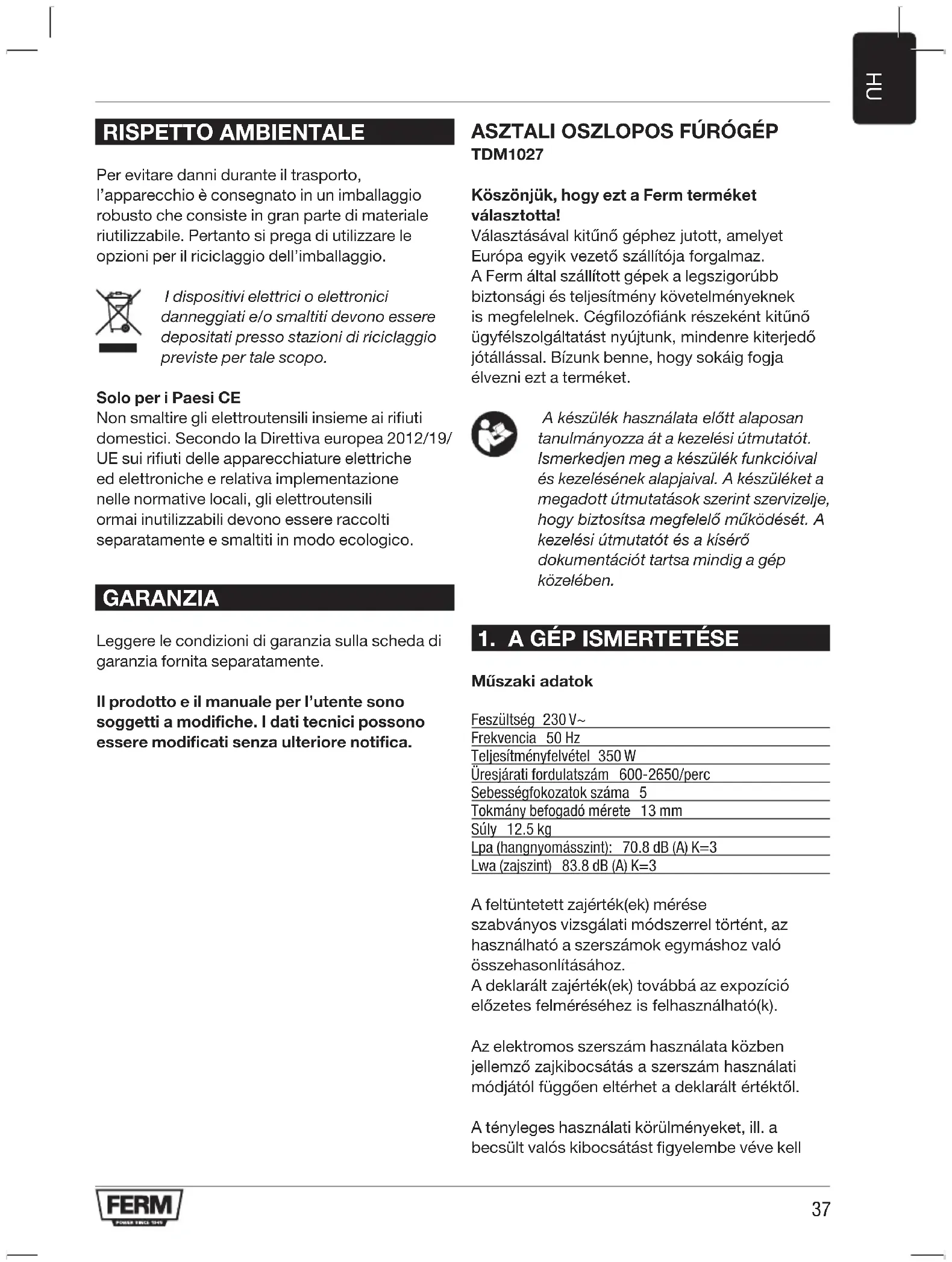 TDM1027 Köszönjük, hogy ezt a Ferm terméket választotta! Választásával kitűnő géphez jutott, amelyet Európa egyik vezető szállítója forgalmaz. A Ferm által szállított gépek a legszigorúbb biztonsági és teljesítmény követelményeknek is megfelelnek. Cégfilozófiánk részeként kitűnő ügyfélszolgáltatást nyújtunk, mindenre kiterjedő jótállással. Bízunk benne, hogy sokáig fogja élvezni ezt a terméket. Akészülékhasználataelőttalaposan tanulmányozza át a kezelési útmutatót. Ismerkedjen meg a készülék funkcióival és kezelésének alapjaival. A készüléket a megadott útmutatások szerint szervizelje, hogybiztosítsamegfelelőműködését.A kezelésiútmutatótésakísérő dokumentációt tartsa mindig a gép közelében.
