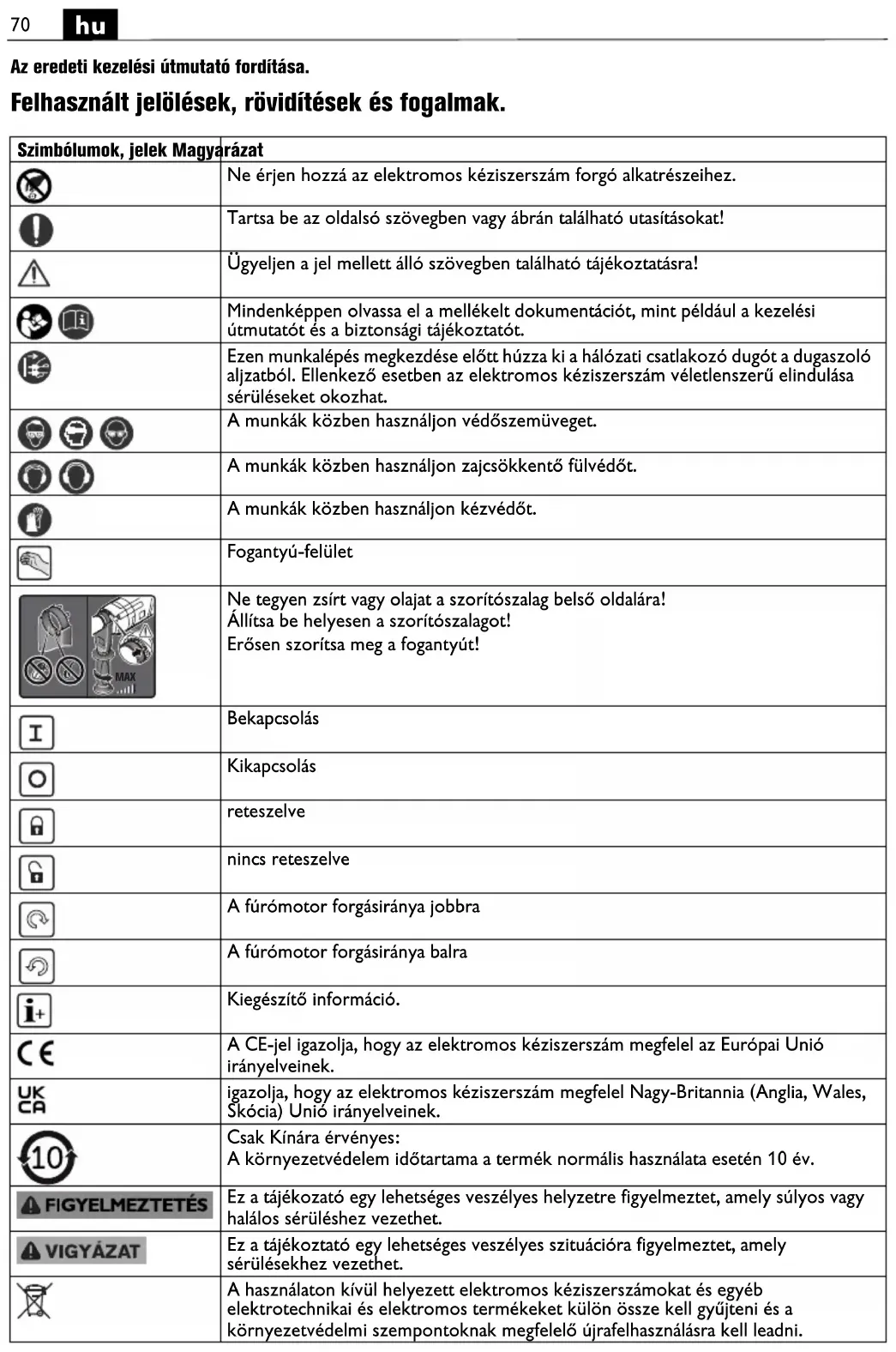 Az eredeti kezelési útmutató fordítása. Felhasznált jelölések, rövidítések és fogalmak. Szimbólumok, jelek Magyarázat Ne érjen hozzá az elektromos kéziszerszám forgó alkatrészeihez. Tartsa be az oldalsó szövegben vagy ábrán található utasításokat! Ügyeljen a jel mellett álló szövegben található tájékoztatásra! Mindenképpen olvassa el a mellékelt dokumentációt, mint például a kezelési útmutatót és a biztonsági tájékoztatót. Ezen munkalépés megkezdése előtt húzza ki a hálózati csatlakozó dugót a dugaszoló aljzatból. Ellenkező esetben az elektromos kéziszerszám véletlenszerű elindulása sérüléseket okozhat. A munkák közben használjon védőszemüveget. A munkák közben használjon zajcsökkentő fülvédőt. A munkák közben használjon kézvédőt. Fogantyú-felület Ne tegyen zsírt vagy olajat a szorítószalag belső oldalára! Állítsa be helyesen a szorítószalagot! Erősen szorítsa meg a fogantyút! Bekapcsolás Kikapcsolás reteszelve nincs reteszelve A fúrómotor forgásiránya jobbra A fúrómotor forgásiránya balra Kiegészítő információ. A CE-jel igazolja, hogy az elektromos kéziszerszám megfelel az Európai Unió irányelveinek. igazolja, hogy az elektromos kéziszerszám megfelel Nagy-Britannia (Anglia, Wales, Skócia) Unió irányelveinek. Csak Kínára érvényes: A környezetvédelem időtartama a termék normális használata esetén 10 év. Ez a tájékozató egy lehetséges veszélyes helyzetre figyelmeztet, amely súlyos vagy halálos sérüléshez vezethet. Ez a tájékoztató egy lehetséges veszélyes szituációra figyelmeztet, amely sérülésekhez vezethet. A használaton kívül helyezett elektromos kéziszerszámokat és egyéb elektrotechnikai és elektromos termékeket külön össze kell gyűjteni és a környezetvédelmi szempontoknak megfelelő újrafelhasználásra kell leadni. MAX71