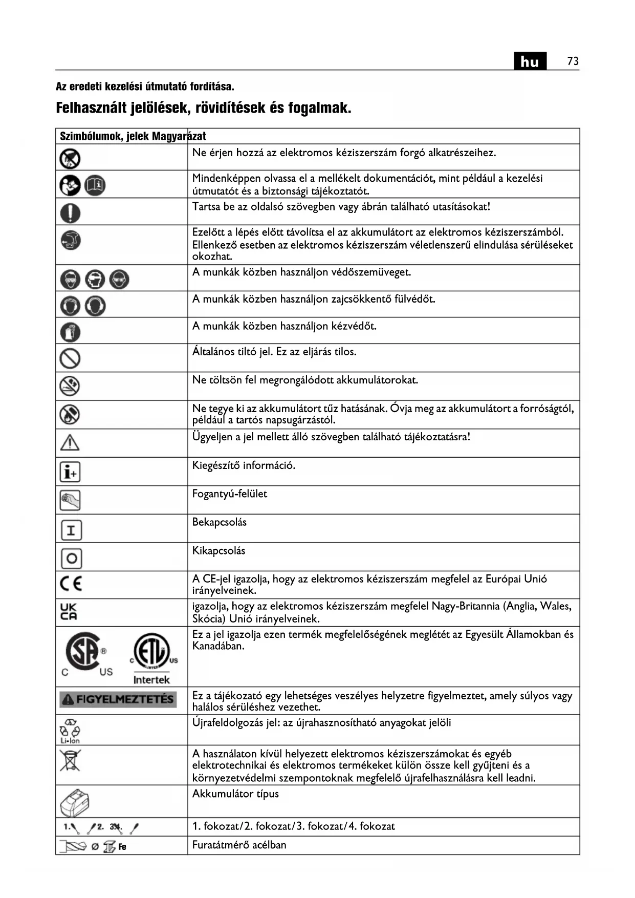 Az eredeti kezelési útmutató fordítása. Felhasznált jelölések, rövidítések és fogalmak. Szimbólumok, jelek Magyarázat Ne érjen hozzá az elektromos kéziszerszám forgó alkatrészeihez. Mindenképpen olvassa el a mellékelt dokumentációt, mint például a kezelési útmutatót és a biztonsági tájékoztatót. Tartsa be az oldalsó szövegben vagy ábrán található utasításokat! Ezelőtt a lépés előtt távolítsa el az akkumulátort az elektromos kéziszerszámból. Ellenkező esetben az elektromos kéziszerszám véletlenszerű elindulása sérüléseket okozhat. A munkák közben használjon védőszemüveget. A munkák közben használjon zajcsökkentő fülvédőt. A munkák közben használjon kézvédőt. Általános tiltó jel. Ez az eljárás tilos. Ne töltsön fel megrongálódott akkumulátorokat. Ne tegye ki az akkumulátort tűz hatásának. Óvja meg az akkumulátort a forróságtól, például a tartós napsugárzástól. Ügyeljen a jel mellett álló szövegben található tájékoztatásra! Kiegészítő információ. Fogantyú-felület Bekapcsolás Kikapcsolás A CE-jel igazolja, hogy az elektromos kéziszerszám megfelel az Európai Unió irányelveinek. igazolja, hogy az elektromos kéziszerszám megfelel Nagy-Britannia (Anglia, Wales, Skócia) Unió irányelveinek. Ez a jel igazolja ezen termék megfelelőségének meglétét az Egyesült Államokban és Kanadában. Ez a tájékozató egy lehetséges veszélyes helyzetre figyelmeztet, amely súlyos vagy halálos sérüléshez vezethet. Újrafeldolgozás jel: az újrahasznosítható anyagokat jelöli A használaton kívül helyezett elektromos kéziszerszámokat és egyéb elektrotechnikai és elektromos termékeket külön össze kell gyűjteni és a környezetvédelmi szempontoknak megfelelő újrafelhasználásra kell leadni. Akkumulátor típus