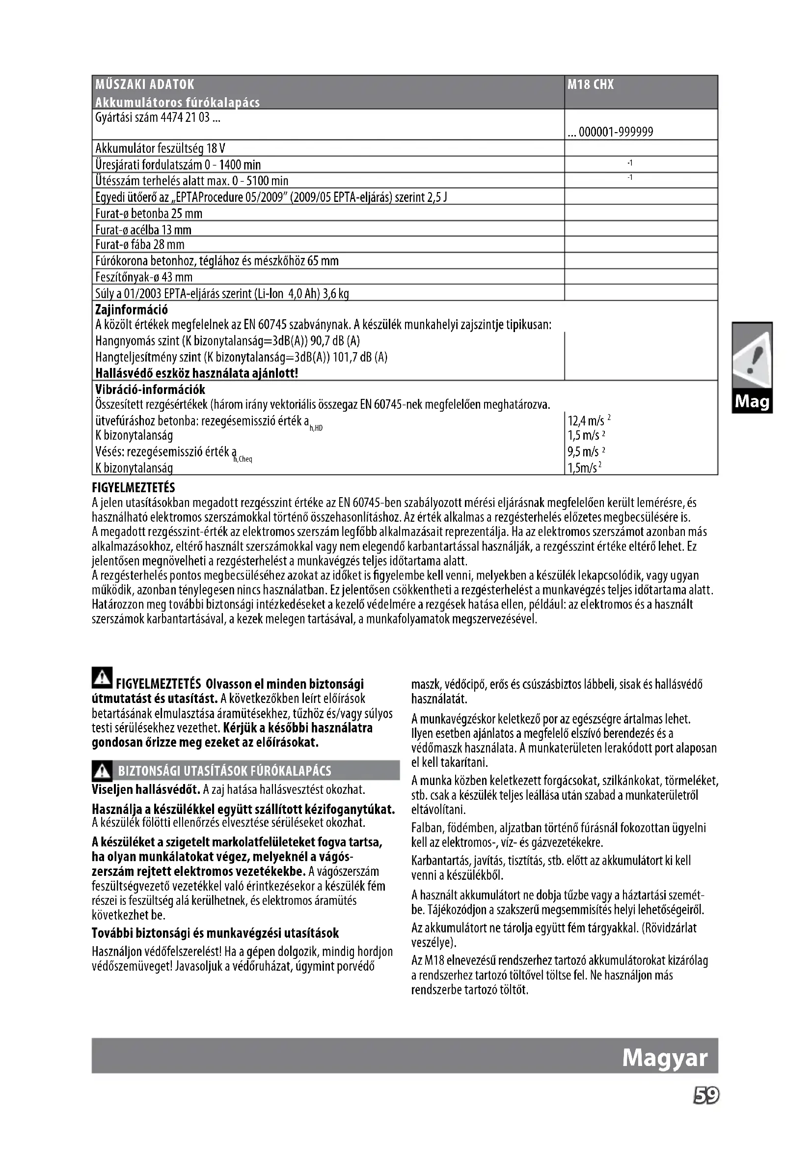 FIGYELMEZTETÉS A jelen utasításokban megadott rezgésszint értéke az EN 60745-ben szabályozott mérési eljárásnak megfelelően került lemérésre, és használható elektromos szerszámokkal történő összehasonlításhoz. Az érték alkalmas a rezgésterhelés előzetes megbecsülésére is. A megadott rezgésszint-érték az elektromos szerszám legfőbb alkalmazásait reprezentálja. Ha az elektromos szerszámot azonban más alkalmazásokhoz, eltérő használt szerszámokkal vagy nem elegendő karbantartással használják, a rezgésszint értéke eltérő lehet. Ez jelentősen megnövelheti a rezgésterhelést a munkavégzés teljes időtartama alatt. A rezgésterhelés pontos megbecsüléséhez azokat az időket is gyelembe kell venni, melyekben a készülék lekapcsolódik, vagy ugyan működik, azonban ténylegesen nincs használatban. Ez jelentősen csökkentheti a rezgésterhelést a munkavégzés teljes időtartama alatt. Határozzon meg további biztonsági intézkedéseket a kezelő védelmére a rezgések hatása ellen, például: az elektromos és a használt szerszámok karbantartásával, a kezek melegen tartásával, a munkafolyamatok megszervezésével. FIGYELMEZTETÉS Olvasson el minden biztonsági útmutatást és utasítást. A következőkben leírt előírások betartásának elmulasztása áramütésekhez, tűzhöz és/vagy súlyos testi sérülésekhez vezethet. Kérjük a későbbi használatra gondosan őrizze meg ezeket az előírásokat. BIZTONSÁGI UTASÍTÁSOK FÚRÓKALAPÁCS Viseljen hallásvédőt. A zaj hatása hallásvesztést okozhat. Használja a készülékkel együtt szállított kézifoganytúkat. A készülék fölötti ellenőrzés elvesztése sérüléseket okozhat. A készüléket a szigetelt markolatfelületeket fogva tartsa, ha olyan munkálatokat végez, melyeknél a vágós- zerszám rejtett elektromos vezetékekbe. A vágószerszám feszültségvezető vezetékkel való érintkezésekor a készülék fém részei is feszültség alá kerülhetnek, és elektromos áramütés következhet be. További biztonsági és munkavégzési utasítások Használjon védőfelszerelést! Ha a gépen dolgozik, mindig hordjon védőszemüveget! Javasoljuk a védőruházat, úgymint porvédő maszk, védőcipő, erős és csúszásbiztos lábbeli, sisak és hallásvédő használatát. A munkavégzéskor keletkező por az egészségre ártalmas lehet. Ilyen esetben ajánlatos a megfelelő elszívó berendezés és a védőmaszk használata. A munkaterületen lerakódott port alaposan el kell takarítani. A munka közben keletkezett forgácsokat, szilkánkokat, törmeléket, stb. csak a készülék teljes leállása után szabad a munkaterületről eltávolítani. Falban, födémben, aljzatban történő fúrásnál fokozottan ügyelni kell az elektromos-, víz- és gázvezetékekre. Karbantartás, javítás, tisztítás, stb. előtt az akkumulátort ki kell venni a készülékből. A használt akkumulátort ne dobja tűzbe vagy a háztartási szemét- be. Tájékozódjon a szakszerű megsemmisítés helyi lehetőségeiről. Az akkumulátort ne tárolja együtt fém tárgyakkal. (Rövidzárlat veszélye). Az M18 elnevezésű rendszerhez tartozó akkumulátorokat kizárólag a rendszerhez tartozó töltővel töltse fel. Ne használjon más rendszerbe tartozó töltőt.60 Mag Magyar Az akkumulátort, töltőt nem szabad megbontani és kizárólag száraz helyen szabad tárolni. Nedvességtől óvni kell. Akkumulátor sav folyhat a sérült akkumulátorból extrém terhelés alatt, vagy extrém hő miatt. Ha az akkumulátor sav a bőrére kerül azonnal mossa meg szappanos vízzel. Szembe kerülés esetén folyóvíz alatt tartsa a szemét minimum 10 percig és azonnal forduljon orvoshoz. Ügyeljen arra, hogy a töltő aknájába ne kerüljön semmilyen fém tárgy, mert ez rövidzárlatot okozhat. FIGYELMEZTETÉS! A rövidzárlat általi tűz, sérülések vagy termékkáro- sodások veszélye elkerülésére ne merítse a szerszámot, a cserélhető akkut vagy a töltőkészüléket folyadékokba, és gondoskodjon arról, hogy ne hatoljanak folyadékok a készülékekbe és az akkukba. A korrozív hatású vagy vezetőképes folyadékok, mint pl. a sós víz, bizonyos vegyi anyagok, fehérítők vagy fehérítő tartalmú termékek, rövidzárlatot okozhatnak. Az M18 elnevezésű rendszerhez tartozó akkumulátorokat kizárólag a rendszerhez tartozó töltővel töltse fel. Ne használjon más rendszerbe tartozó töltőt.Az akkumulátort, töltőt nem szabad megbontani és kizárólag száraz helyen szabad tárolni. Nedvességtől óvni kell.
