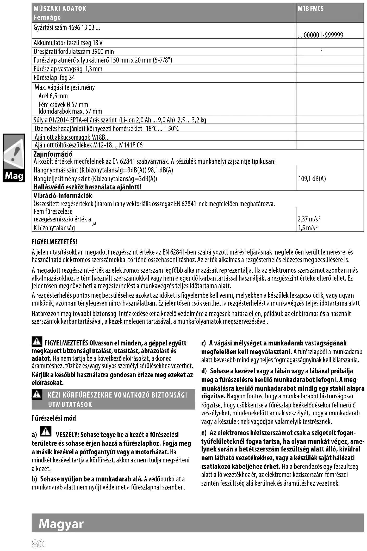 Fűrészlap átmérő x lyukátmérő 150 mm x 20 mm (5-7/8") Fűrészlap vastagság 1,3 mm Fűrészlap-fog 34 Max. vágási teljesítmény Acél 6,5 mm Fém csövek Ø 57 mm Idomdarabok max. 57 mm Súly a 01/2014 EPTA-eljárás szerint (Li-Ion 2,0 Ah ... 9,0 Ah) 2,5 ... 3,2 kg Üzemeléshez ajánlott környezeti hőmérséklet -18°C ... +50°C Ajánlott akkucsomagok M18B... Ajánlott töltőkészülékek M12-18..., M1418 C6 Zajinformáció A közölt értékek megfelelnek az EN 62841 szabványnak. A készülék munkahelyi zajszintje tipikusan: Hangnyomás szint (K bizonytalanság=3dB(A)) 98,1 dB(A) Hangteljesítmény szint (K bizonytalanság=3dB(A)) 109,1 dB(A) Hallásvédő eszköz használata ajánlott! Vibráció-információk Összesített rezgésértékek (három irány vektoriális összegaz EN 62841-nek megfelelően meghatározva. Fém fűrészelése rezegésemisszió érték a h,M 2,37 m/s