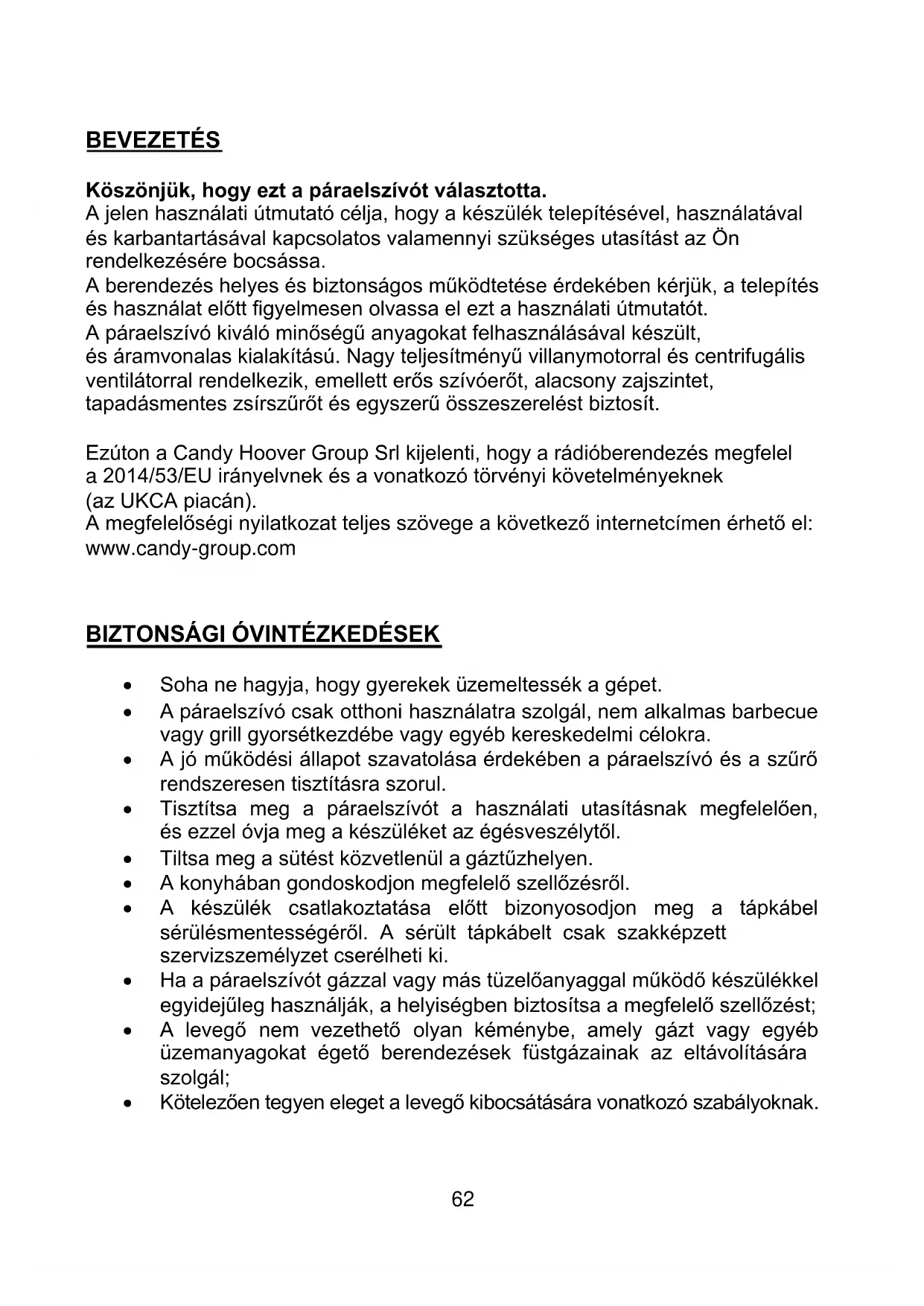 BEVEZETÉS Köszönjük, hogy ezt a páraelszívót választotta. A jelen használati útmutató célja, hogy a készülék telepítésével, használatával és karbantartásával kapcsolatos valamennyi szükséges utasítást az Ön rendelkezésére bocsássa. A berendezés helyes és biztonságos működtetése érdekében kérjük, a telepítés és használat előtt figyelmesen olvassa el ezt a használati útmutatót. A páraelszívó kiváló minőségű anyagokat felhasználásával készült, és áramvonalas kialakítású. Nagy teljesítményű villanymotorral és centrifugális ventilátorral rendelkezik, emellett erős szívóerőt, alacsony zajszintet, tapadásmentes zsírszűrőt és egyszerű összeszerelést biztosít. Ezúton a Candy Hoover Group Srl kijelenti, hogy a rádióberendezés megfelel a 2014/53/EU irányelvnek és a vonatkozó törvényi követelményeknek (az UKCA piacán). A megfelelőségi nyilatkozat teljes szövege a következő internetcímen érhető el: www.candy-group.com