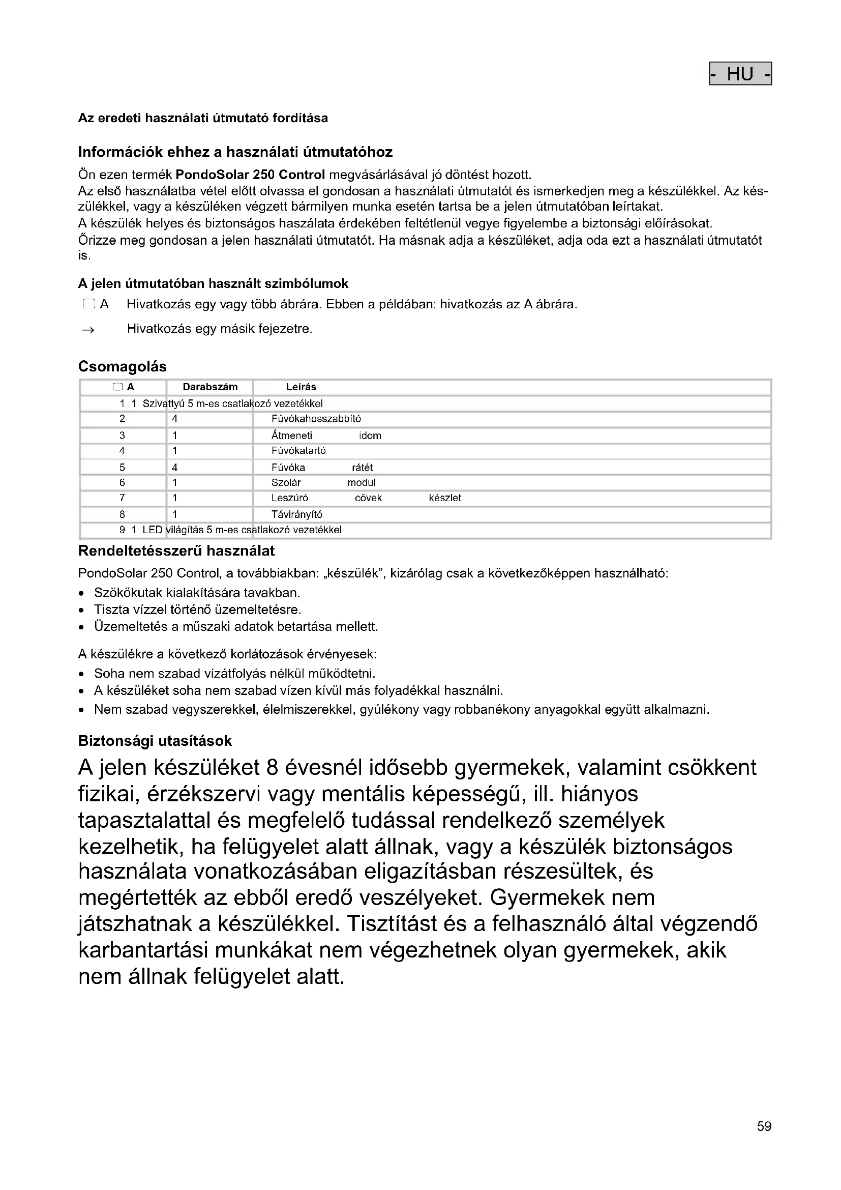 Információk ehhez a használati útmutatóhoz Ön ezen termék PondoSolar 250 Control megvásárlásával jó döntést hozott. Az első használatba vétel előtt olvassa el gondosan a használati útmutatót és ismerkedjen meg a készülékkel. Az kés- zülékkel, vagy a készüléken végzett bármilyen munka esetén tartsa be a jelen útmutatóban leírtakat. A készülék helyes és biztonságos haszálata érdekében feltétlenül vegye figyelembe a biztonsági előírásokat. Őrizze meg gondosan a jelen használati útmutatót. Ha másnak adja a készüléket, adja oda ezt a használati útmutatót is.