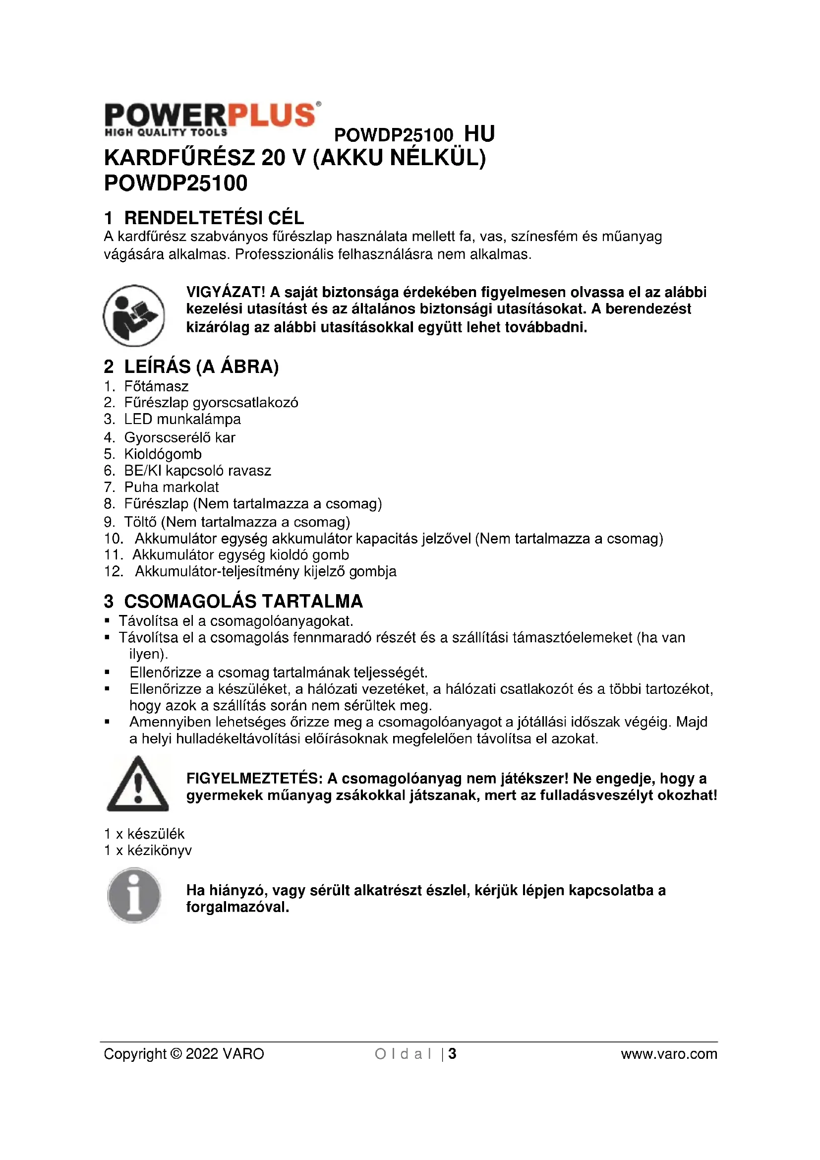 - Bármely beállítás végrehajtása, a tartozékok cseréje vagy a szerszám eltevése előtt húzza ki a csatlakozót a tápaljzatból. Ezek az elővigyázatossági intézkedések megakadályozzák a véletlenszerű indítást.POWDP25100 HU Copyright © 2022 VARO O l d a l | 6 www.varo.com