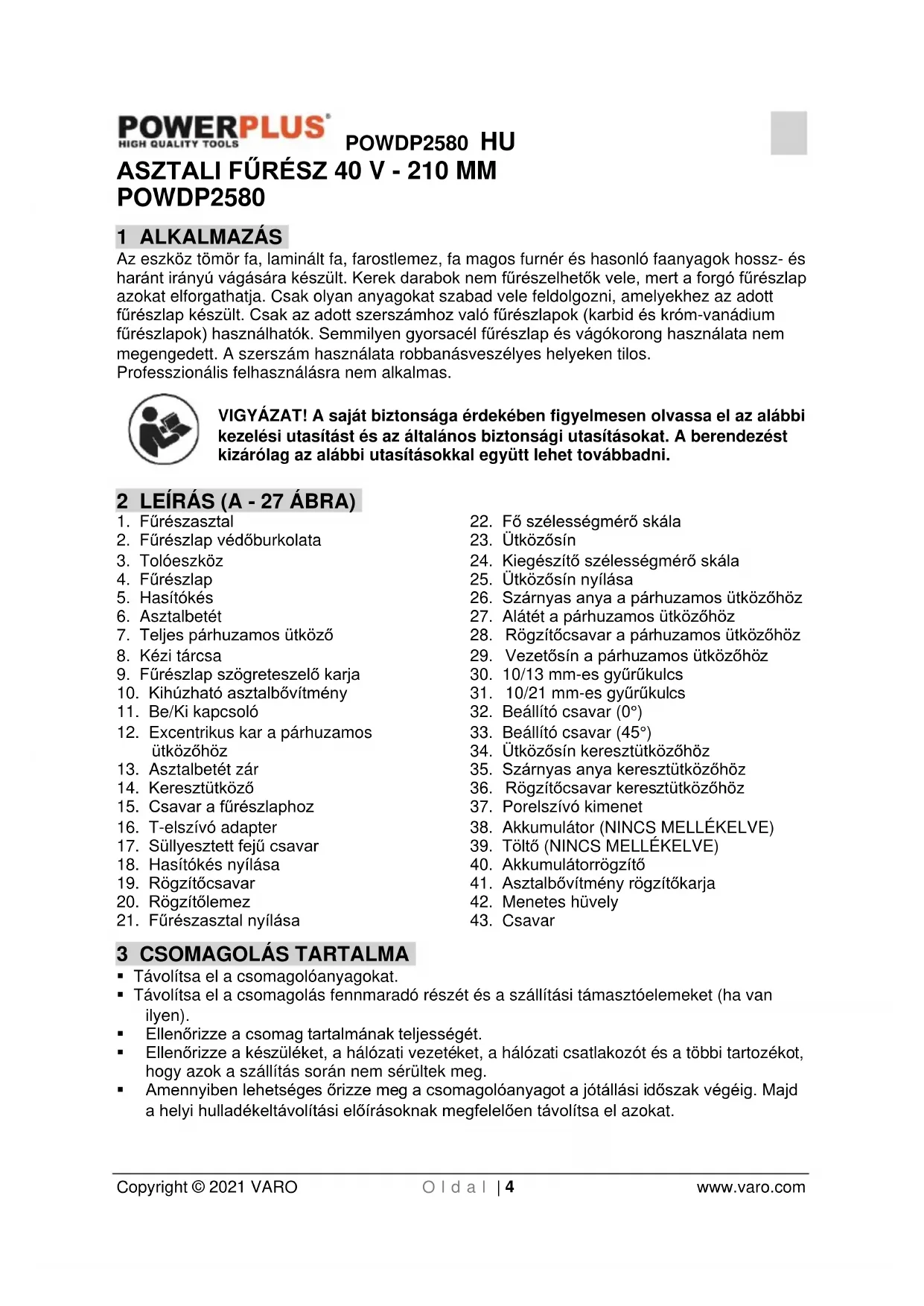 Copyright © 2021 VARO O l d a l | 4 www.varo.com ASZTALI FŰRÉSZ 40 V - 210 MM POWDP2580 1 ALKALMAZÁS Az eszköz tömör fa, laminált fa, farostlemez, fa magos furnér és hasonló faanyagok hossz- és haránt irányú vágására készült. Kerek darabok nem fűrészelhetők vele, mert a forgó fűrészlap azokat elforgathatja. Csak olyan anyagokat szabad vele feldolgozni, amelyekhez az adott fűrészlap készült. Csak az adott szerszámhoz való fűrészlapok (karbid és króm-vanádium fűrészlapok) használhatók. Semmilyen gyorsacél fűrészlap és vágókorong használata nem megengedett. A szerszám használata robbanásveszélyes helyeken tilos. Professzionális felhasználásra nem alkalmas. VIGYÁZAT! A saját biztonsága érdekében figyelmesen olvassa el az alábbi kezelési utasítást és az általános biztonsági utasításokat. A berendezést kizárólag az alábbi utasításokkal együtt lehet továbbadni. 2 LEÍRÁS (A - 27 ÁBRA)