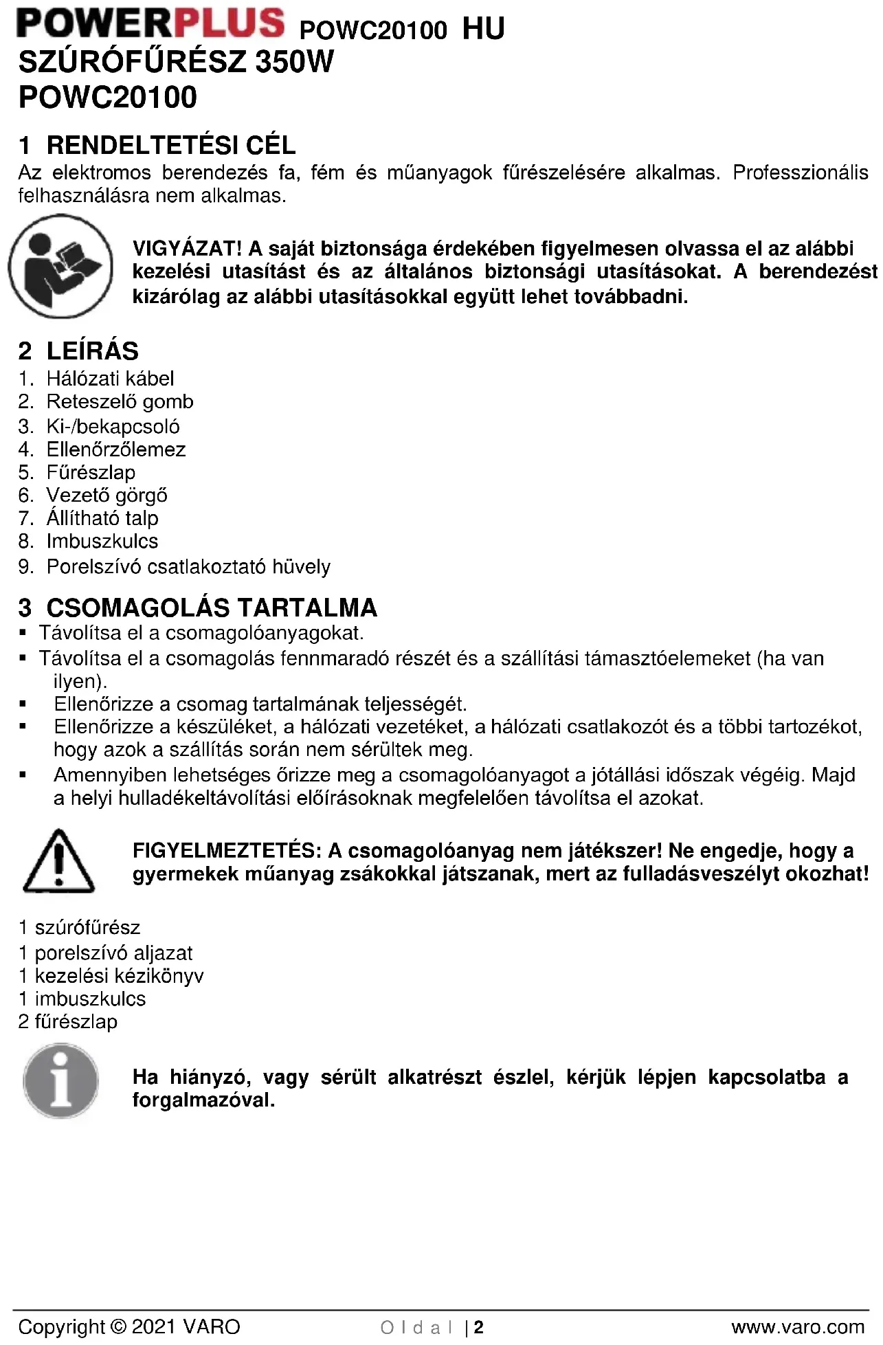 - Ugyanakkor, ha a készülék sérülése a karbantartás elmulasztásának vagy túlterhelésnek a következménye, akkor a jótállásra nem lehet kárigényt benyújtani.POWC20100 HU Copyright © 2021 VARO O l d a l | 7 www.varo.com