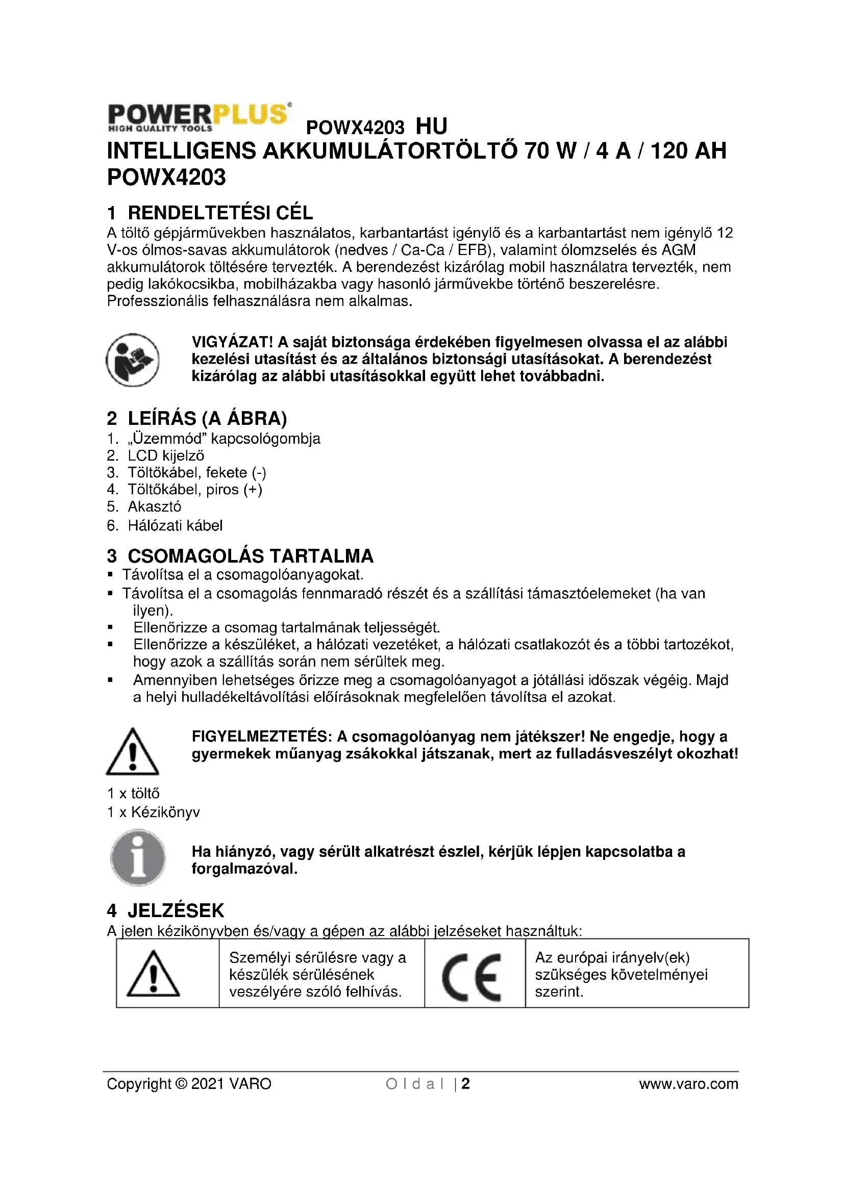 - VARO-Vic. Van Rompuy N.V. - Joseph Van Instraat 9 - BE2500 Lier - BELGIUM, kijelenti, hogy A termék típusa: Intelligens töltő Márkanév: POWERplus Cikkszám: POWX4203 megfelel a harmonizált európai szabványok alkalmazásán alapuló, idevonatkozó európai irányelvek alapvető követelményeinek és egyéb vonatkozó rendelkezéseinek. A készülék bármilyen illetéktelen módosítása érvényteleníti a jelen nyilatkozatot. Európai irányelvek (ideértve, adott esetben, azok módosításait az aláírás időpontjáig): 2011/65/EU 2014/30/EU 2014/35/EU Harmonizált európai szabványok (ideértve, adott esetben, azok módosításait az aláírás időpontjáig): EN60335-1 : 2012 EN60335-2-29 : 2004 EN55014-1 : 2017 EN55014-2 : 2015 EN61000-3-2 : 2014 EN61000-3-3 : 2013 A műszaki dokumentáció birtokosa: Philippe Vankerkhove, VARO - Vic. Van Rompuy N.V. Az alulírott a társaság vezérigazgatója nevében jár el, Philippe Vankerkhove Szabályozási Ügyek - Megfelelőségi Menedzser Lier, 27/11/2020POWX4203 RU Copyright © 2021 VARO С т р . | 1 www.varo.com 1 ИСПОЛЬЗОВАНИЕ ПО НАЗНАЧЕНИЮ p. 2