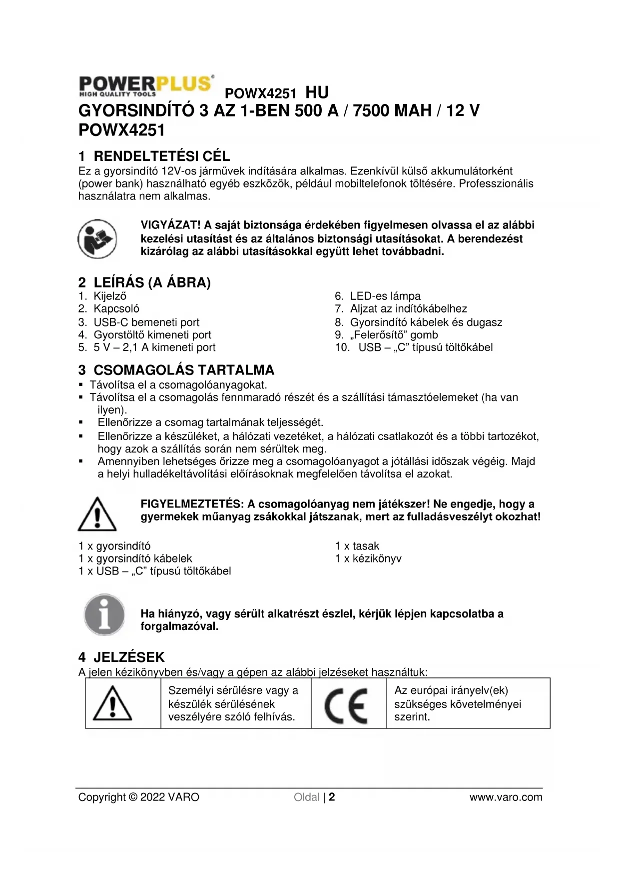 - A 12V-os járművek indításához alkalmas; veszélyt jelentene egyéb járművek indítása esetén.POWX4251 HU Copyright © 2022 VARO Oldal | 5 www.varo.com