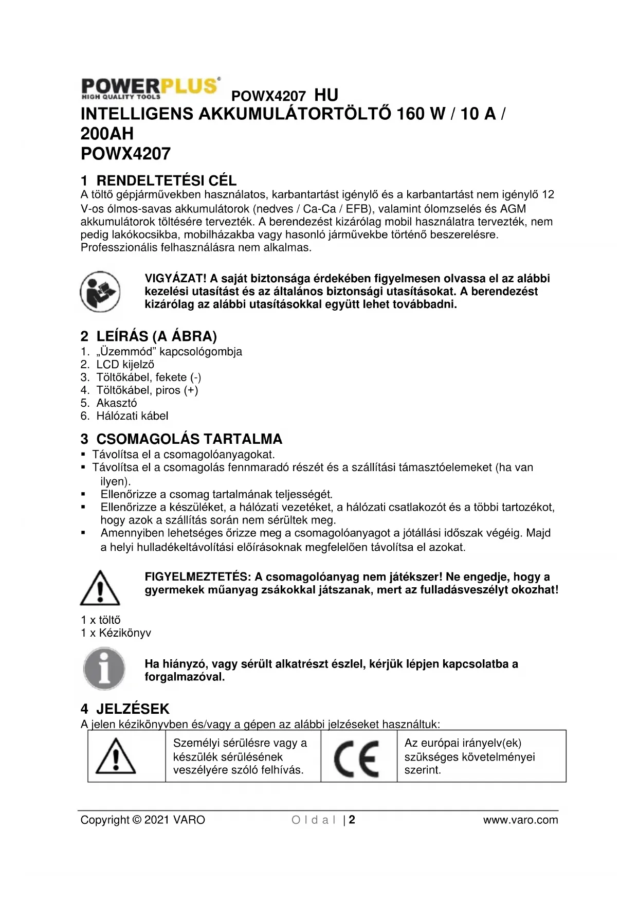- VARO-Vic. Van Rompuy N.V. - Joseph Van Instraat 9 - BE2500 Lier - BELGIUM, kijelenti, hogy A termék típusa: Intelligens töltő Márkanév: POWERplus Cikkszám: POWX4207 megfelel a harmonizált európai szabványok alkalmazásán alapuló, idevonatkozó európai irányelvek alapvető követelményeinek és egyéb vonatkozó rendelkezéseinek. A készülék bármilyen illetéktelen módosítása érvényteleníti a jelen nyilatkozatot. Európai irányelvek (ideértve, adott esetben, azok módosításait az aláírás időpontjáig): 2011/65/EU 2014/30/EU 2014/35/EU Harmonizált európai szabványok (ideértve, adott esetben, azok módosításait az aláírás időpontjáig): EN60335-1 : 2012 EN60335-2-29 : 2004 EN55014-1 : 2017 EN55014-2 : 2015 EN61000-3-2 : 2014 EN61000-3-3 : 2013 A műszaki dokumentáció birtokosa: Philippe Vankerkhove, VARO - Vic. Van Rompuy N.V. Az alulírott a társaság vezérigazgatója nevében jár el, Philippe Vankerkhove Szabályozási Ügyek - Megfelelőségi Menedzser Lier, 27/11/2020POWX4207 RU Copyright © 2021 VARO С т р . | 1 www.varo.com 1 ИСПОЛЬЗОВАНИЕ ПО НАЗНАЧЕНИЮ p. 2