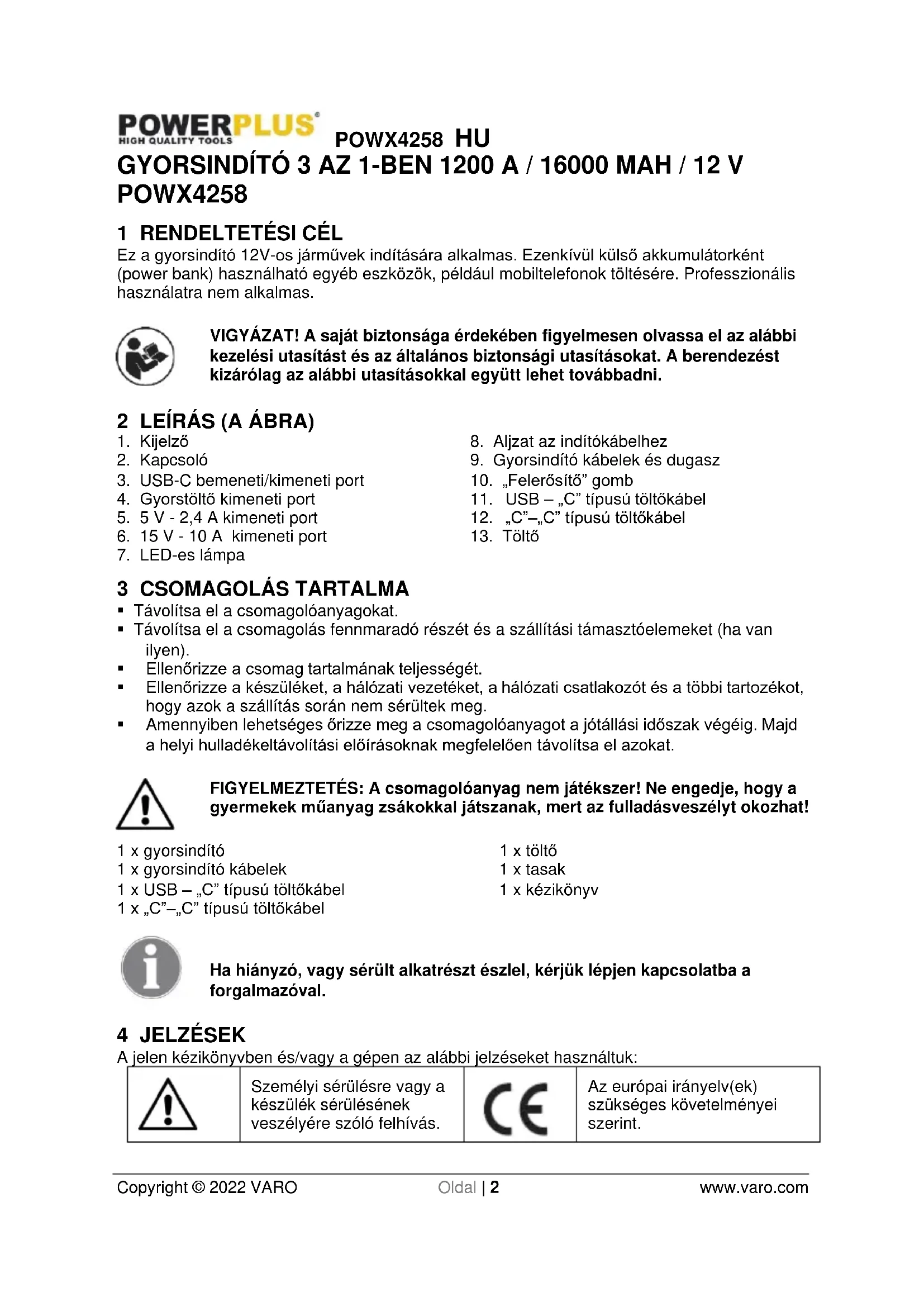 - A 12V-os járművek indításához alkalmas; veszélyt jelentene egyéb járművek indítása esetén.POWX4258 HU Copyright © 2022 VARO Oldal | 5 www.varo.com