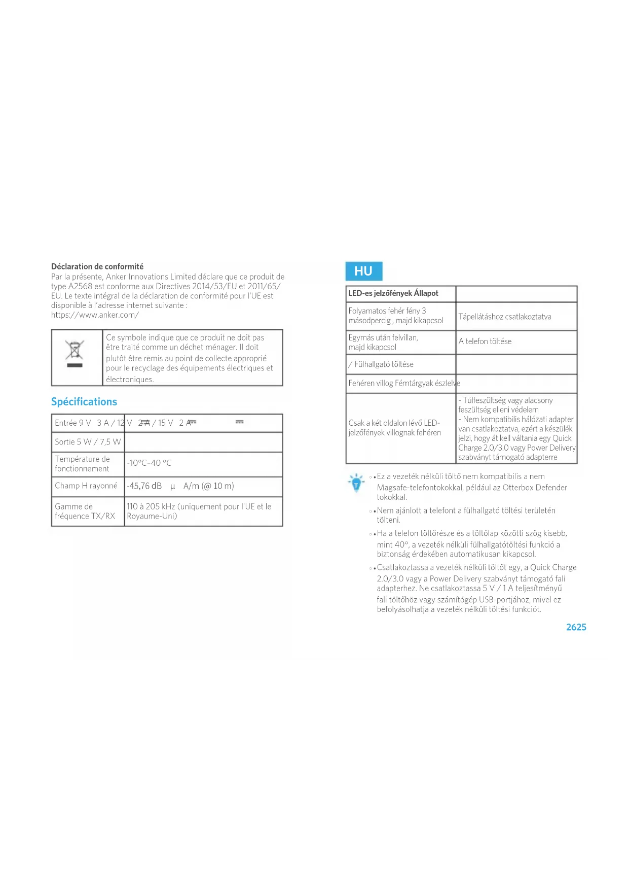 A termék tisztításához csak száraz törlőkendőt vagy kefét használjon. Ez a termék megfelel az Európai Közösség rádiózavarokra vonatkozó követelményeinek. Megfelelőségi nyilatkozat Ezennel az Anker Innovations Limited kijelenti, hogy az A2568 típusú termék megfelel a 2014/53/EU és 2011/65/EU irányelveknek. Az EU-s megfelelőségi nyilatkozat teljes szövege a következő internetcímen érhető el: https://www.anker.com/ Ez a szimbólum azt jelzi, hogy ez a termék nem kezelhető háztartási hulladékként. Ehelyett az elektromos és elektronikus berendezések újrafeldolgozására szolgáló gyűjtőhelyen kell átadni. Műszaki adatok Bemenet 9 V 3 A / 12 V 2 A / 15 V 2 A Kimenet 5 W/7,5 W Üzemi hőmérséklet -10°C–40 °C Sugárzott H-mező -45,76dB μ A/m(@10m) TX/RX- frekvenciatartomány 110–205 kHz (csak az EU és az Egyesült Királyság esetén)