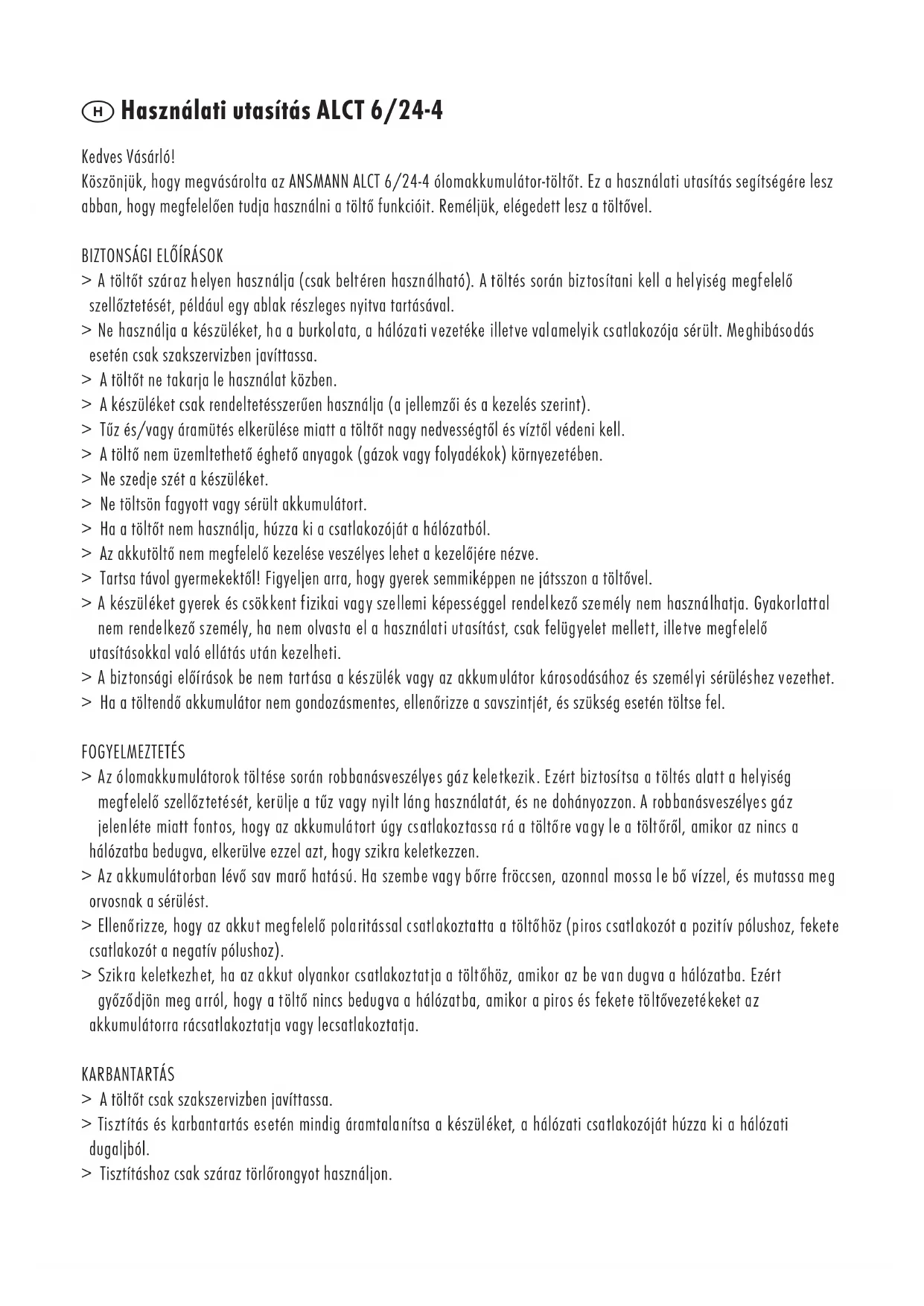 Bemeneti feszültség 230 V AC/50Hz Védelmi osztály II Védelem IP65 Töltési feszültség 6 V: 7,25V/12 V: 14,5 V/24 V: 29,0 V Töltési feszültség COLD TEMP. 6 V: 7,45V/12 V: 14,9 V/24 V: 29,8 V Beállítható töltőáram 1 A/2 A/4 A Akkumulátor kapacitása 4,5 Ah – 160Ah FELELŐSSÉGVÁLLALÁS ELHÁRÍTÁSA A használati utasításban található információkat a gyártó előzetes bejelentés nélkül megváltoztathatja. A gyártó nem vállal felelősséget közvetlen, közvetett, véletlenszerű vagy egyéb olyan meghibásodásért, ami a készülék jelen használa- ti utasításában megadottól eltérő használatból adódik, valamint a következményes kárért. GARANCIA A gyártó 3 éves garanciát vállal a készülékre. A garancia nem vonatkozik a használati utasításban leírtak figyelmen kívül hagyásából eredő károkra illetve a nem megfelelő használatból adódó fizikai sérülésekre. A gyártó fenntartja magának a jogot, hogy a termék műszaki adatait előzetes bejelentés nélkül megváltoztassa. Az esetleges elírásokért, nyomdai hibákért felelősséget nem vállal. 06/2014 Forgalmazza: Kapacitás Kft. 1115 Budapest, Szentpétery u. 24-26. Tel.: (+36 1) 463-0888; Fax: (+36 1) 463-0899 E-mail: info@kapacitas.hu www.akku.huI Manuale di istruzioni ALCT 6/24-4 PREFAZIONE Gentile Cliente, Grazie per aver acquistato il caricabatterie ANSMANN ALCT 6-24/4. Queste istruzioni per l‘uso l’aiuteranno a utilizzare tutte le caratteristiche del ALCT 6-24/4. Ci auguriamo che rimanga soddisfatto del suo nuovo caricabatterie. Il team ANSMANN