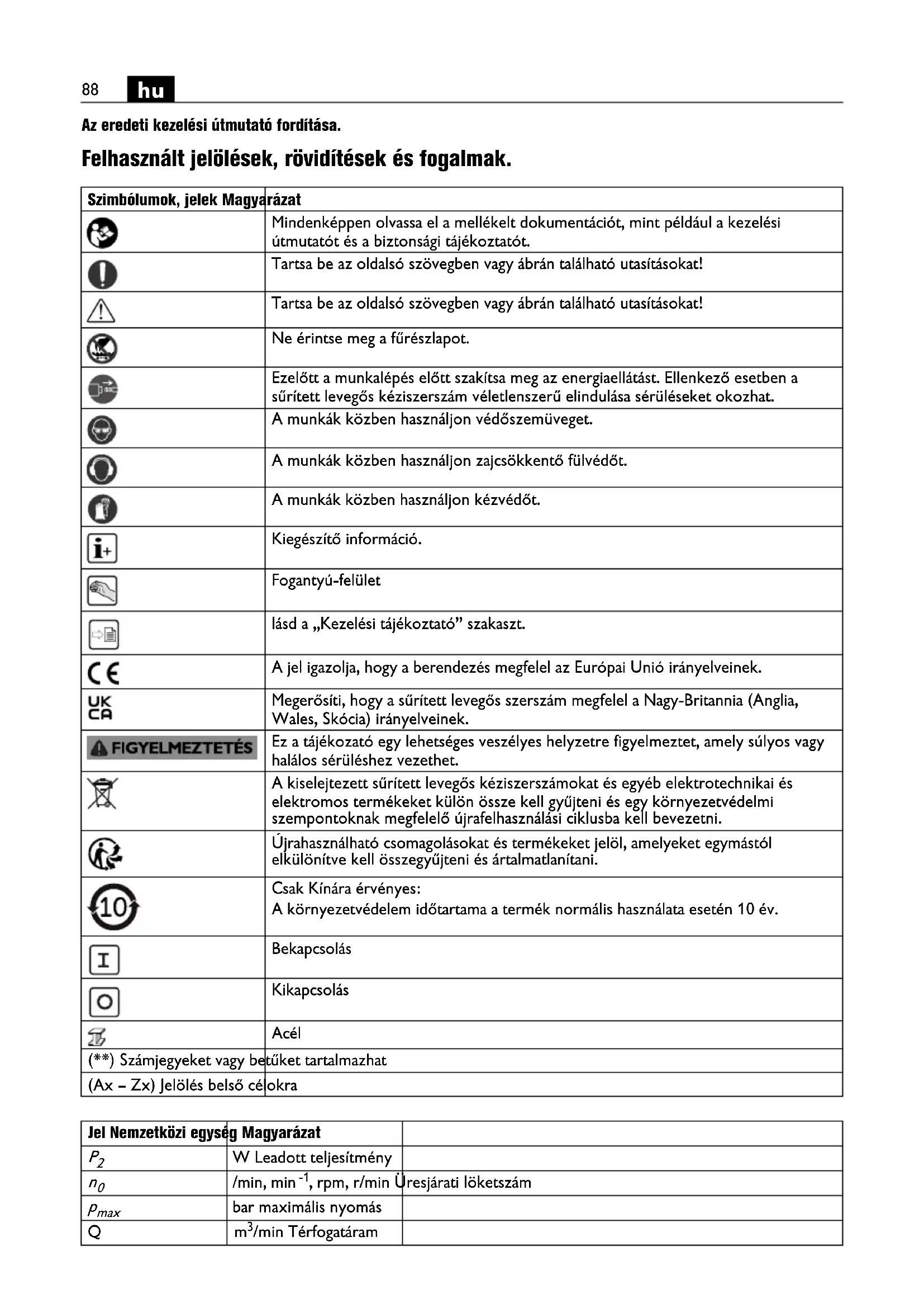 Az eredeti kezelési útmutató fordítása. Felhasznált jelölések, rövidítések és fogalmak. Szimbólumok, jelek Magyarázat Mindenképpen olvassa el a mellékelt dokumentációt, mint például a kezelési útmutatót és a biztonsági tájékoztatót. Tartsa be az oldalsó szövegben vagy ábrán található utasításokat! Tartsa be az oldalsó szövegben vagy ábrán található utasításokat! Ne érintse meg a fűrészlapot. Ezelőtt a munkalépés előtt szakítsa meg az energiaellátást. Ellenkező esetben a sűrített levegős kéziszerszám véletlenszerű elindulása sérüléseket okozhat. A munkák közben használjon védőszemüveget. A munkák közben használjon zajcsökkentő fülvédőt. A munkák közben használjon kézvédőt. Kiegészítő információ. Fogantyú-felület lásd a „Kezelési tájékoztató” szakaszt. A jel igazolja, hogy a berendezés megfelel az Európai Unió irányelveinek. Megerősíti, hogy a sűrített levegős szerszám megfelel a Nagy-Britannia (Anglia, Wales, Skócia) irányelveinek. Ez a tájékozató egy lehetséges veszélyes helyzetre figyelmeztet, amely súlyos vagy halálos sérüléshez vezethet. A kiselejtezett sűrített levegős kéziszerszámokat és egyéb elektrotechnikai és elektromos termékeket külön össze kell gyűjteni és egy környezetvédelmi szempontoknak megfelelő újrafelhasználási ciklusba kell bevezetni. Újrahasználható csomagolásokat és termékeket jelöl, amelyeket egymástól elkülönítve kell összegyűjteni és ártalmatlanítani. Csak Kínára érvényes: A környezetvédelem időtartama a termék normális használata esetén 10 év. Bekapcsolás Kikapcsolás Acél (**) Számjegyeket vagy betűket tartalmazhat (Ax – Zx) Jelölés belső célokra Jel Nemzetközi egység Magyarázat