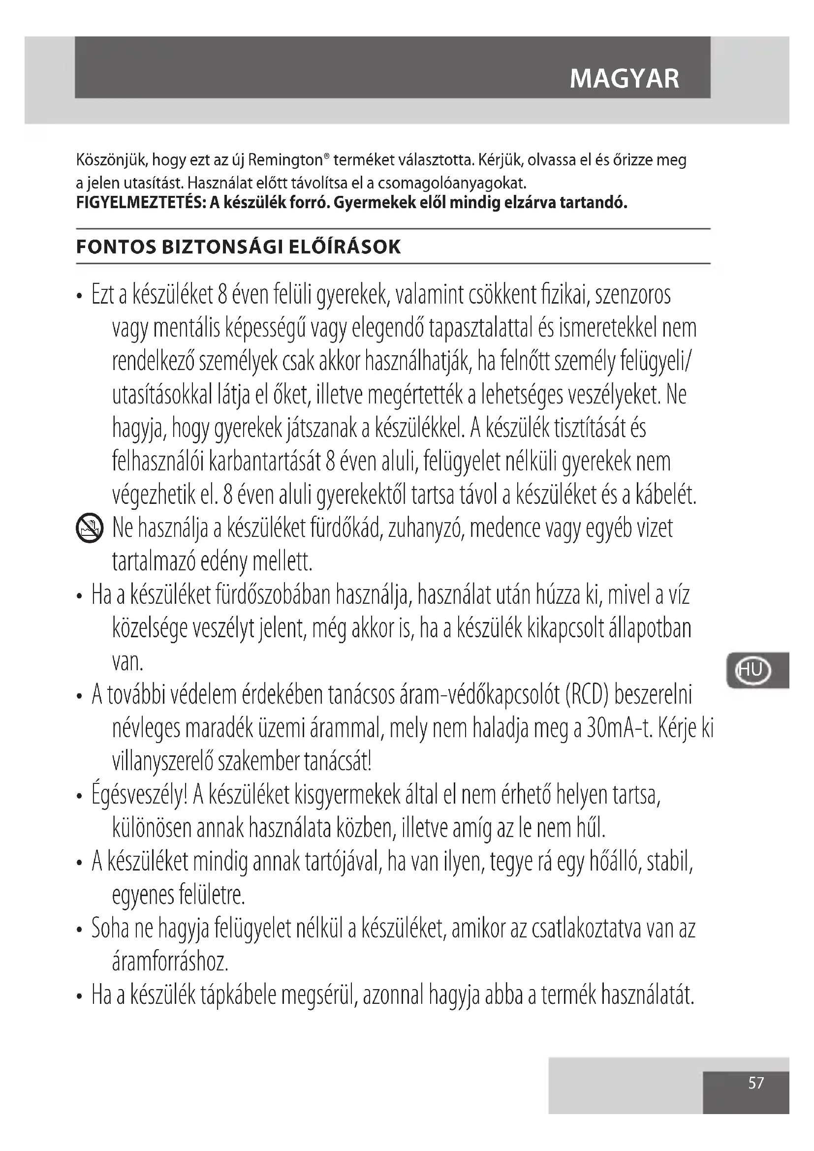- Ezt a készüléket 8 éven felüli gyerekek, valamint csökkent fizikai, szenzoros vagy mentális képességű vagy elegendő tapasztalattal és ismeretekkel nem rendelkező személyek csak akkor használhatják, ha felnőtt személy felügyeli/ utasításokkal látja el őket, illetve megértették a lehetséges veszélyeket. Ne hagyja, hogy gyerekek játszanak a készülékkel. A készülék tisztítását és felhasználói karbantartását 8 éven aluli, felügyelet nélküli gyerekek nem végezhetik el. 8 éven aluli gyerekektől tartsa távol a készüléket és a kábelét. L Ne használja a készüléket fürdőkád, zuhanyzó, medence vagy egyéb vizet tartalmazó edény mellett.