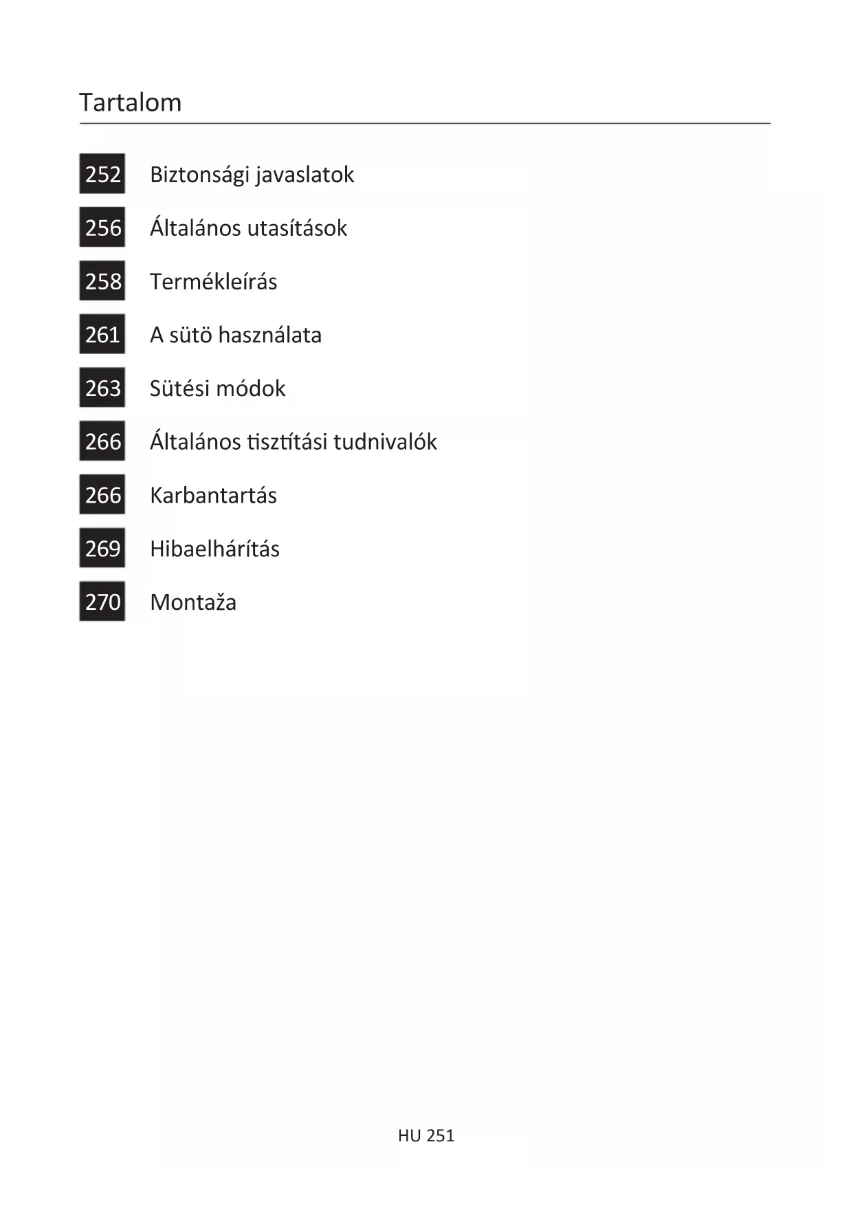 HU Ha a bútor hátul és alul is zárt, akkor biz- tosítson egy nyílást a hálóza csatlakozókábel számára. HU Ha a sütőben nincs hűtővenlátor, hozzon létre egy 460 mm x 15 mm nyílást HU Agyarto nem vallal felelősseget az ebben a kiadvanyban előfordulo nyomtatasi es elirasi hibakbol eredő pontatlansagokert. Abiztonsaggal vagy aműkodessel kapcsolatos jellemzők serelme nelkul fenntartjuk a jogot a termekek szukseg szerin valtoztatasara.DE 271 Sicherheitshinweise Allgemeine Anweisungen Produktbeschreibung Betrieb des Backofens Kochmodi Reinigung und Wartung des Backofens Allgemeine Reinigungshinweise Häug gestellte fragen Installaon Zusammenfassung
