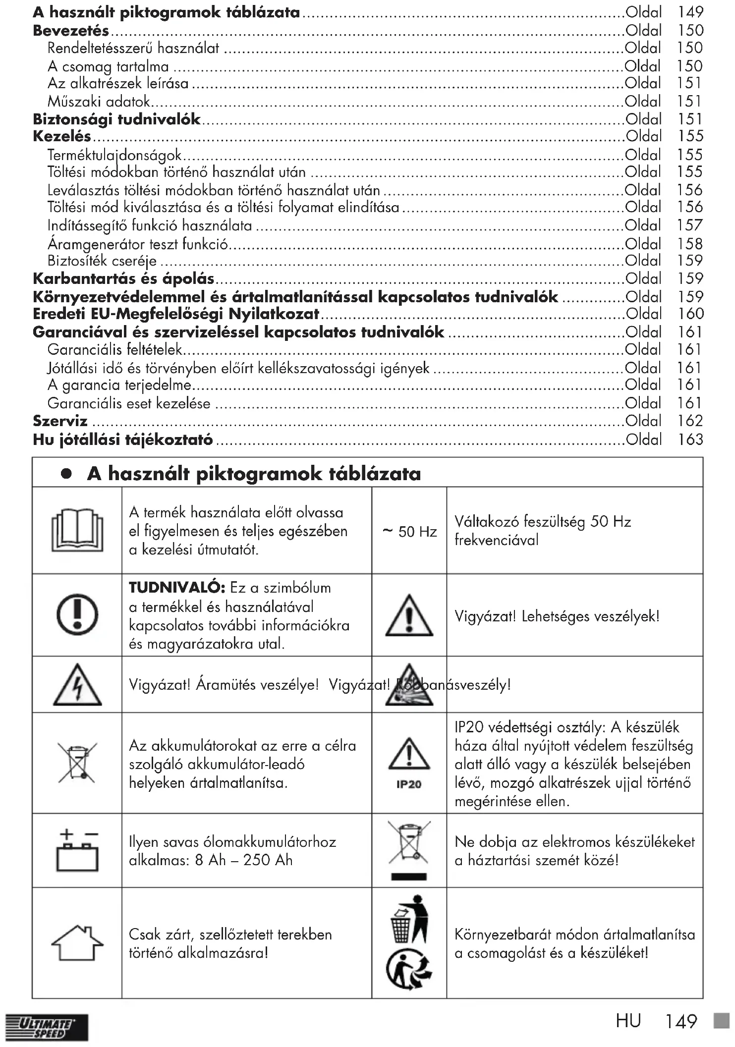 Ezen kivül a keszülékkel regenerlhatja a lemerült akumulatorokat (akkumulatortipustol fuggoen). Az akumulatortö szikraképzódes vagy tulmelegedes elleni védóaramkörrel rendelkezik. Örizzpe meg gondosan ezt az utmutatôt. Ha továbbadja a terméket egy harmadik fel szamára, mellekelje hozza az összes dokumentumot. Minden, a rendeltetesszeru hasznalattól eltero alkalmazás tilos, és adott esetben veszelyes lehet. A garancia nem vonatkozik az utmutató be nem tartásaból vagy a nem rendeltetesszeru hasznalatból eredő károkra, és a gyárto ceget sem terheli felelosség ilyen esetben. A keszülék ipari hasznalatra nem alkalmas. Ipari hasznalat eseten a garancia érvényét veszti.
