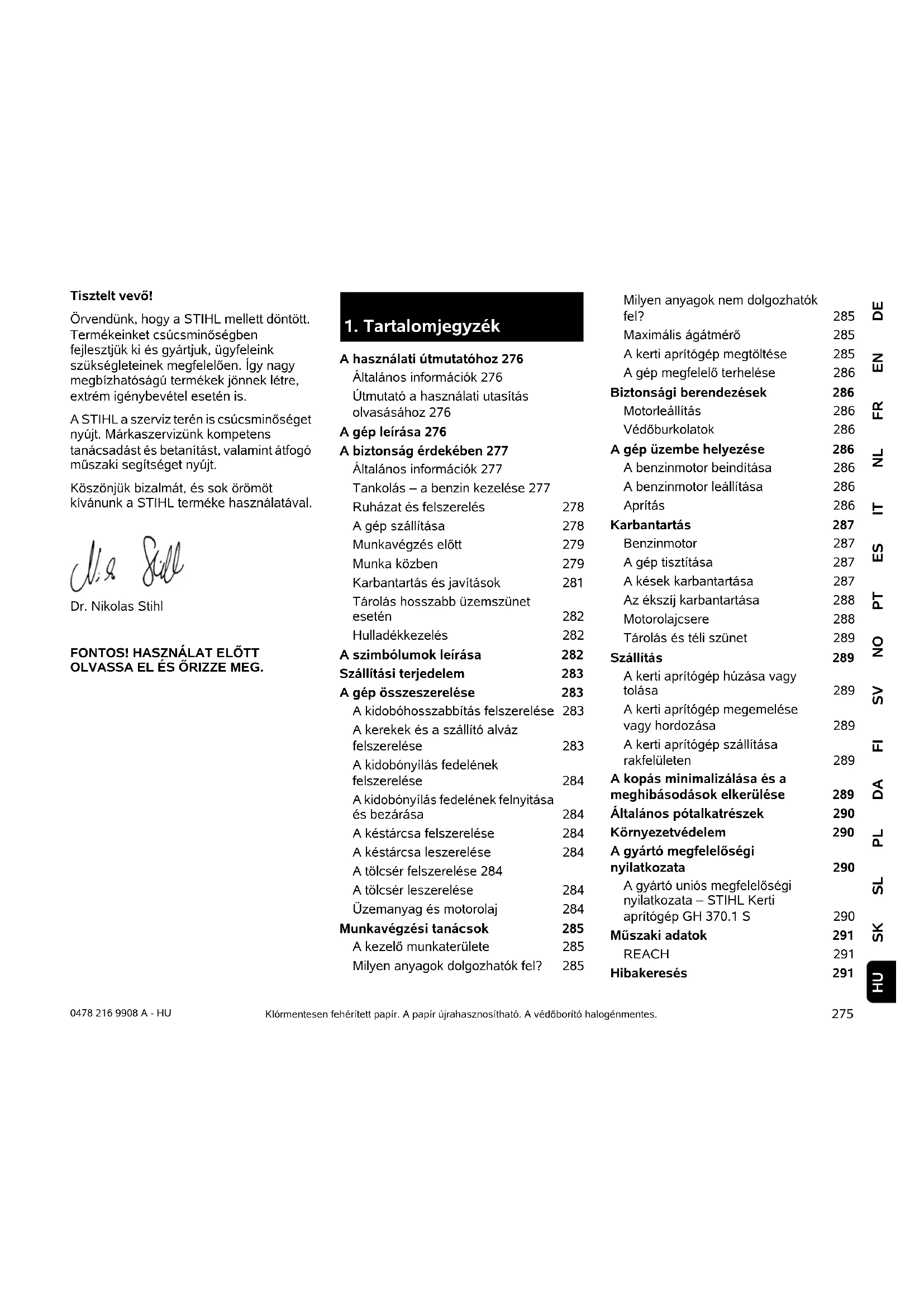 A használati útmutatóhoz 276 Általános információk 276 Útmutató a használati utasítás olvasásához 276 A gép leírása 276 A biztonság érdekében 277 Általános információk 277 Tankolás – a benzin kezelése 277 Ruházat és felszerelés 278 A gép szállítása 278 Munkavégzés előtt 279 Munka közben 279 Karbantartás és javítások 281 Tárolás hosszabb üzemszünet esetén 282 Hulladékkezelés 282 A szimbólumok leírása 282 Szállítási terjedelem 283 A gép összeszerelése 283 A kidobóhosszabbítás felszerelése 283 A kerekek és a szállító alváz felszerelése 283 A kidobónyílás fedelének felszerelése 284 A kidobónyílás fedelének felnyitása és bezárása 284 A késtárcsa felszerelése 284 A késtárcsa leszerelése 284 A tölcsér felszerelése 284 A tölcsér leszerelése 284 Üzemanyag és motorolaj 284 Munkavégzési tanácsok 285 A kezelő munkaterülete 285 Milyen anyagok dolgozhatók fel? 285 Milyen anyagok nem dolgozhatók fel? 285 Maximális ágátmérő 285 A kerti aprítógép megtöltése 285 A gép megfelelő terhelése 286 Biztonsági berendezések 286 Motorleállítás 286 Védőburkolatok 286 A gép üzembe helyezése 286 A benzinmotor beindítása 286 A benzinmotor leállítása 286 Aprítás 286 Karbantartás 287 Benzinmotor 287 A gép tisztítása 287 A kések karbantartása 287 Az ékszíj karbantartása 288 Motorolajcsere 288 Tárolás és téli szünet 289 Szállítás 289 A kerti aprítógép húzása vagy tolása 289 A kerti aprítógép megemelése vagy hordozása 289 A kerti aprítógép szállítása rakfelületen 289 A kopás minimalizálása és a meghibásodások elkerülése 289 Általános pótalkatrészek 290 Környezetvédelem 290 A gyártó megfelelőségi nyilatkozata 290 A gyártó uniós megfelelőségi nyilatkozata – STIHL Kerti aprítógép GH 370.1 S 290 Műszaki adatok 291 REACH 291 Hibakeresés 2910478 216 9908 A - HU