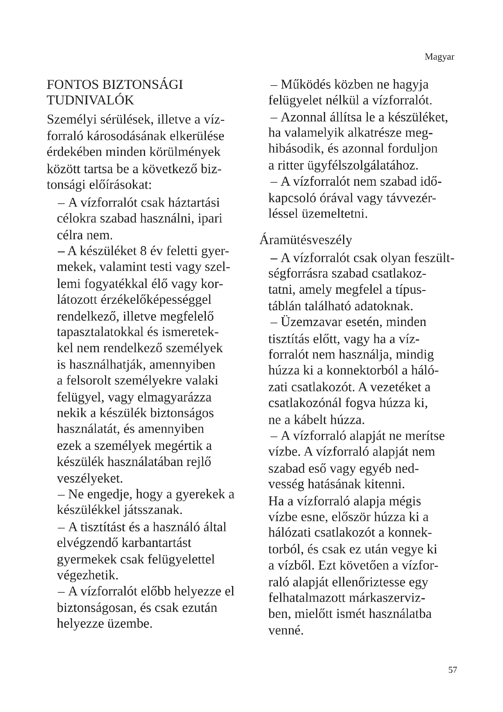 TUDNIVALÓK Személyi sérülések, illetve a víz- forraló károsodásának elkerülése érdekében minden körülmények között tartsa be a következő biz- tonsági előírásokat: – A vízforralót csak háztartási célokra szabad használni, ipari célra nem. – A készüléket 8 év feletti gyer- mekek, valamint testi vagy szel- lemi fogyatékkal élő vagy kor- látozott érzékelőképességgel rendelkező, illetve megfelelő tapasztalatokkal és ismeretek- kel nem rendelkező személyek is használhatják, amennyiben a felsorolt személyekre valaki felügyel, vagy elmagyarázza nekik a készülék biztonságos használatát, és amennyiben ezek a személyek megértik a készülék használatában rejlő veszélyeket. – Ne engedje, hogy a gyerekek a készülékkel játsszanak. – A tisztítást és a használó által elvégzendő karbantartást gyermekek csak felügyelettel végezhetik. – A vízforralót előbb helyezze el biztonságosan, és csak ezután helyezze üzembe. – Működés közben ne hagyja felügyelet nélkül a vízforralót. – Azonnal állítsa le a készüléket, ha valamelyik alkatrésze meg- hibásodik, és azonnal forduljon a ritter ügyfélszolgálatához. – A vízforralót nem szabad idő- kapcsoló órával vagy távvezér- léssel üzemeltetni. Áramütésveszély – A vízforralót csak olyan feszült- ségforrásra szabad csatlakoz- tatni, amely megfelel a típus- táblán található adatoknak. – Üzemzavar esetén, minden tisztítás előtt, vagy ha a víz- forralót nem használja, mindig húzza ki a konnektorból a háló- zati csatlakozót. A vezetéket a csatlakozónál fogva húzza ki, ne a kábelt húzza. – A vízforraló alapját ne merítse vízbe. A vízforraló alapját nem szabad eső vagy egyéb ned- vesség hatásának kitenni. Ha a vízforraló alapja mégis vízbe esne, először húzza ki a hálózati csatlakozót a konnek- torból, és csak ez után vegye ki a vízből. Ezt követően a vízfor- raló alapját ellenőriztesse egy felhatalmazott márkaszerviz- ben, mielőtt ismét használatba venné.58 Magyar – A vízforraló alapját soha ne fogja meg nedves kézzel. A vízforralót nem szabad hasz- nálni, ha az alapja nedves vagy vizes, vagy ha nedves felületen áll. Ne üzemeltesse a vízforra- lót a szabadban. – A kifolyt vizet és kondenzvi- zet mindig azonnal törölje le. Ilyenkor előbb mindig húzza ki a hálózati csatlakozót a konnektorból. – Ne töltsön vizet a víztartályba, ha a víztartály az alapon áll, mivel az esetleg kifröccsenő víz áramütéshez vezethet. – Csak akkor üzemeltesse a vízforralót, ha a hálózati kábe- len, az alapon és a víztartá- lyon nincs látható károsodás. Ha a hálózati kábel sérült, a személyi sérülések elkerülése érdekében a gyártóval, annak ügyfélszolgálatával vagy egyéb szakemberrel cseréltesse ki. – A vízforraló alapja ne érint- kezzen fém tárgyakkal, pl. ne próbálja meg fém tárgyakkal szerelni a vízforraló alapját. – A vízforralót csak a hozzá tartozó alappal működtesse (típus: fontana